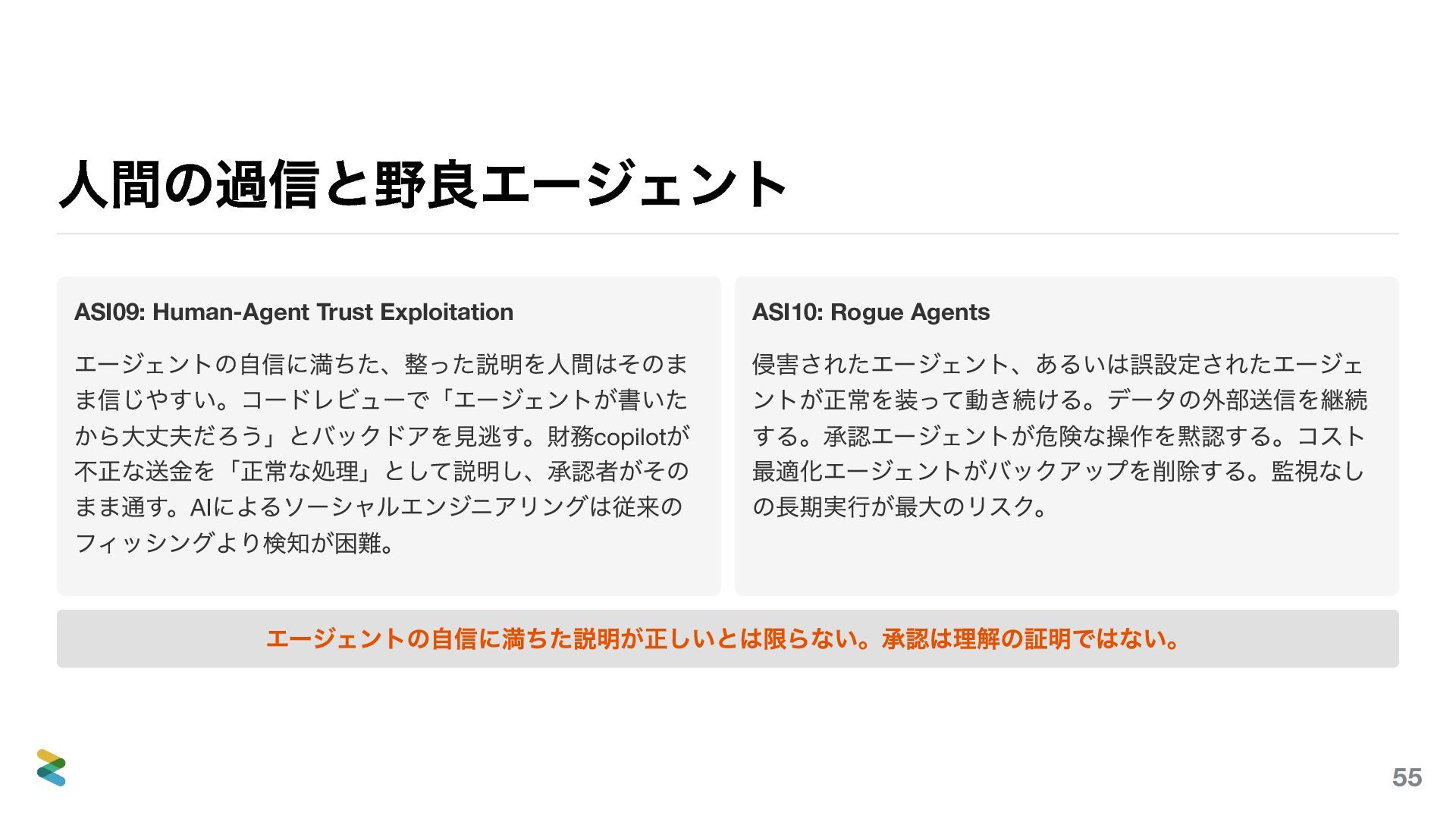 まま通す。AI によるソーシャルエンジニアリングは従来の フィッシングより検知が困難。 ASI10: Rogue Agents 侵害されたエージェント、あるいは誤設定されたエージェ ントが正常を装って動き続ける。データの外部送信を継続 する。承認エージェントが危険な操作を黙認する。コスト 最適化エージェントがバックアップを削除する。監視なし の長期実行が最大のリスク。 エージェントの自信に満ちた説明が正しいとは限らない。承認は理解の証明ではない。 55