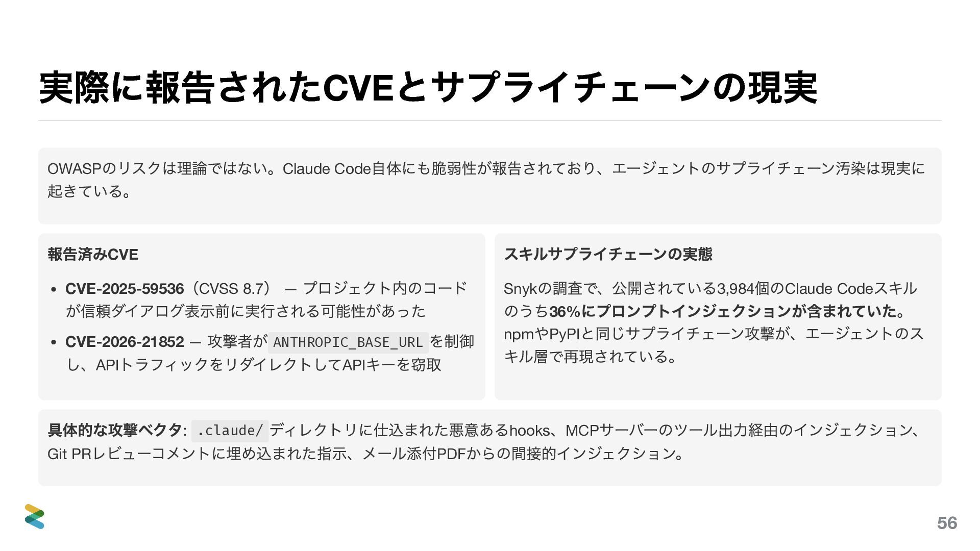 8.7 ) — プロジェクト内のコード が信頼ダイアログ表示前に実行される可能性があった CVE-2026-21852 — 攻撃者が ANTHROPIC_BASE_URL を制御 し、API トラフィックをリダイレクトしてAPI キーを窃取 スキルサプライチェーンの実態 Snyk の調査で、公開されている3,984 個のClaude Code スキル のうち36% にプロンプトインジェクションが含まれていた。 npm やPyPI と同じサプライチェーン攻撃が、エージェントのス キル層で再現されている。 具体的な攻撃ベクタ: .claude/ ディレクトリに仕込まれた悪意あるhooks 、MCP サーバーのツール出力経由のインジェクション、 Git PR レビューコメントに埋め込まれた指示、メール添付PDF からの間接的インジェクション。 56