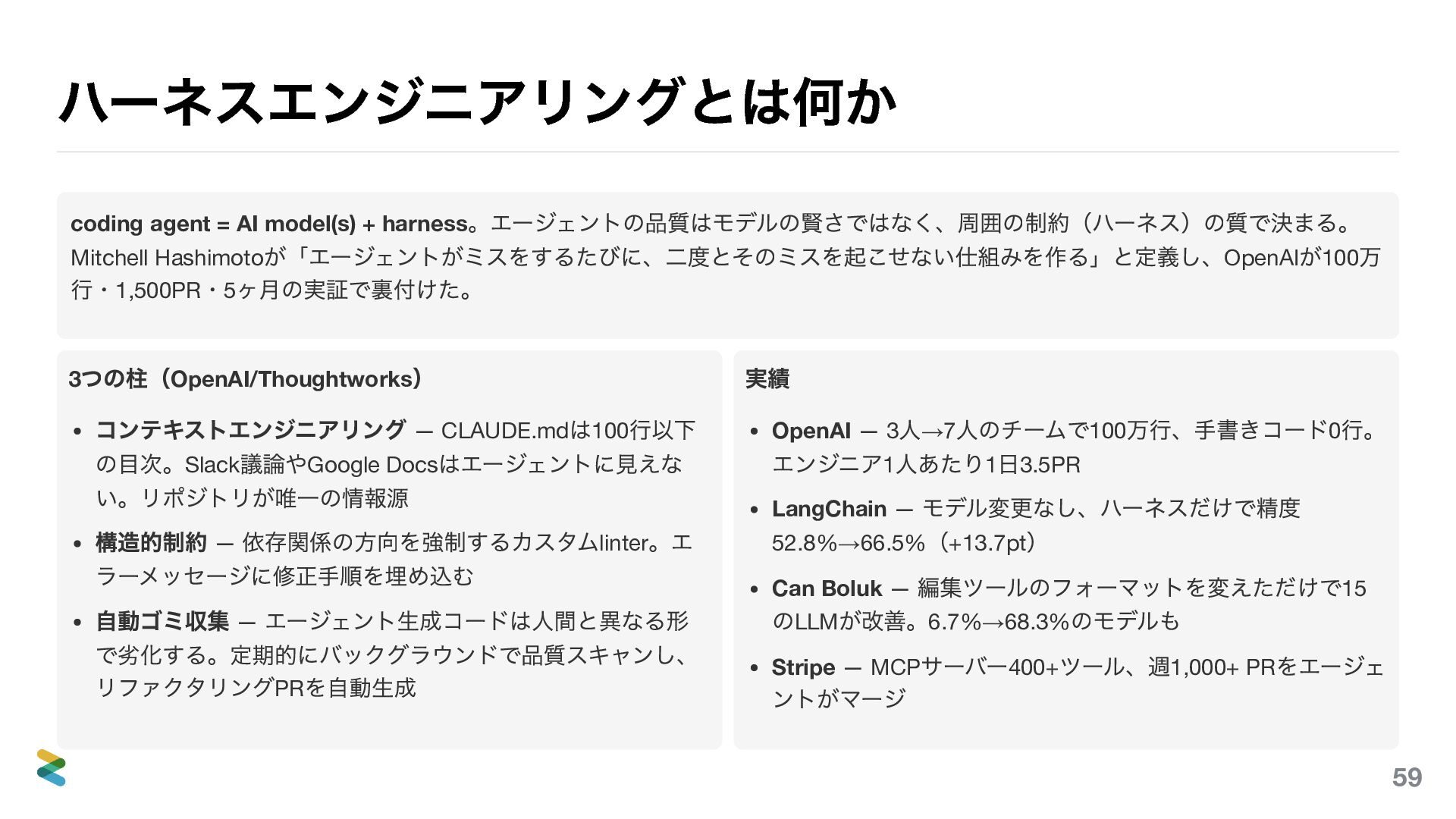 Hashimoto が「エージェントがミスをするたびに、二度とそのミスを起こせない仕組みを作る」と定義し、OpenAI が100 万 行・1,500PR ・5 ヶ月の実証で裏付けた。 3 つの柱(OpenAI/Thoughtworks ) コンテキストエンジニアリング — CLAUDE.md は100 行以下 の目次。Slack 議論やGoogle Docs はエージェントに見えな い。リポジトリが唯一の情報源 構造的制約 — 依存関係の方向を強制するカスタムlinter 。エ ラーメッセージに修正手順を埋め込む 自動ゴミ収集 — エージェント生成コードは人間と異なる形 で劣化する。定期的にバックグラウンドで品質スキャンし、 リファクタリングPR を自動生成 実績 OpenAI — 3 人→7 人のチームで100 万行、手書きコード0 行。 エンジニア1 人あたり1 日3.5PR LangChain — モデル変更なし、ハーネスだけで精度 52.8%→66.5% (+13.7pt ) Can Boluk — 編集ツールのフォーマットを変えただけで15 のLLM が改善。6.7%→68.3% のモデルも Stripe — MCP サーバー400+ ツール、週1,000+ PR をエージェ ントがマージ 59