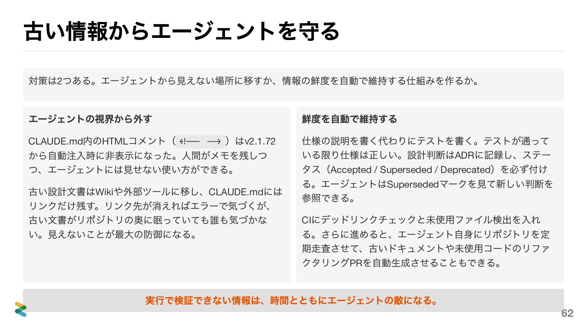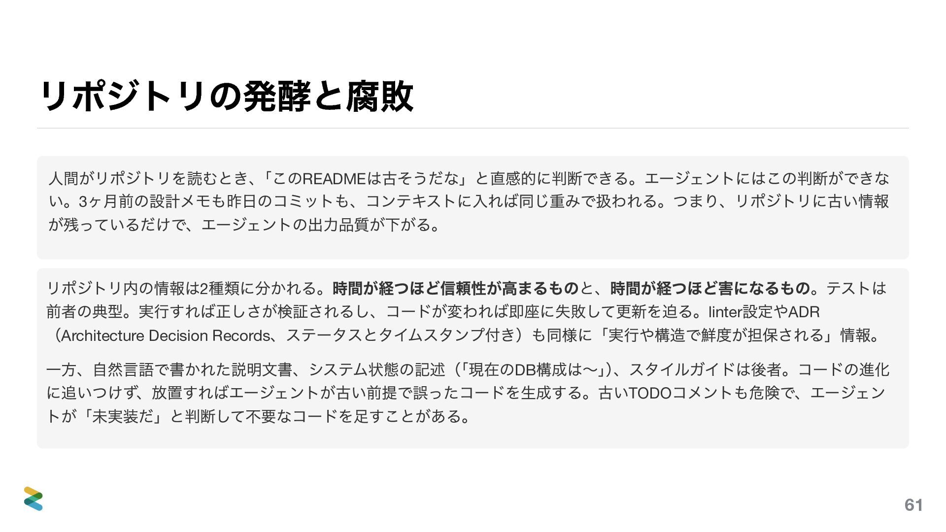 設定やADR (Architecture Decision Records 、ステータスとタイムスタンプ付き)も同様に「実行や構造で鮮度が担保される」情報。 一方、自然言語で書かれた説明文書、システム状態の記述( 「現在のDB 構成は〜」 ) 、スタイルガイドは後者。コードの進化 に追いつけず、放置すればエージェントが古い前提で誤ったコードを生成する。古いTODO コメントも危険で、エージェン トが「未実装だ」と判断して不要なコードを足すことがある。 61