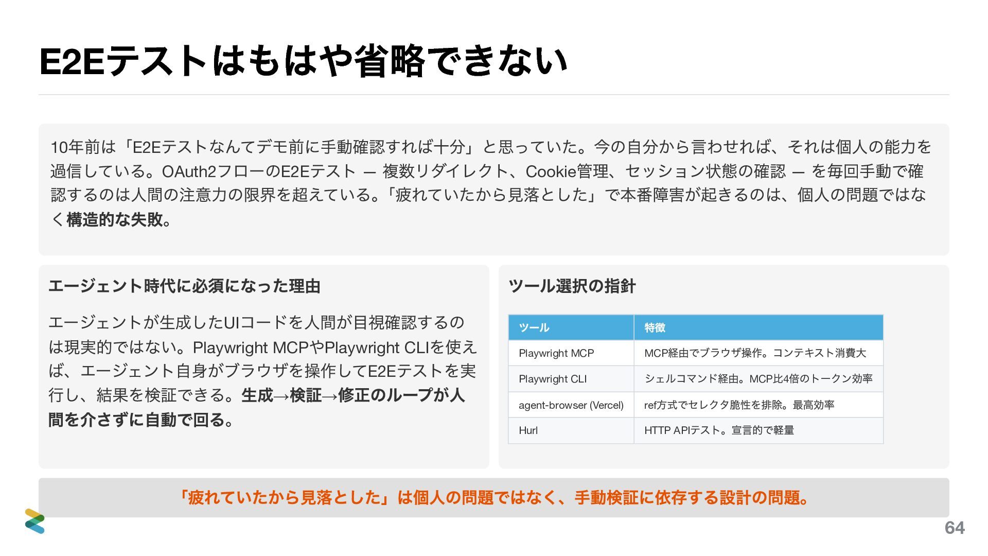 管理、セッション状態の確認 — を毎回手動で確 認するのは人間の注意力の限界を超えている。 「疲れていたから見落とした」で本番障害が起きるのは、個人の問題ではな く構造的な失敗。 エージェント時代に必須になった理由 エージェントが生成したUI コードを人間が目視確認するの は現実的ではない。Playwright MCP やPlaywright CLI を使え ば、エージェント自身がブラウザを操作してE2E テストを実 行し、結果を検証できる。生成→ 検証→ 修正のループが人 間を介さずに自動で回る。 ツール選択の指針 ツール 特徴 Playwright MCP MCP 経由でブラウザ操作。コンテキスト消費大 Playwright CLI シェルコマンド経由。MCP 比4 倍のトークン効率 agent-browser (Vercel) ref 方式でセレクタ脆性を排除。最高効率 Hurl HTTP API テスト。宣言的で軽量 「疲れていたから見落とした」は個人の問題ではなく、手動検証に依存する設計の問題。 64