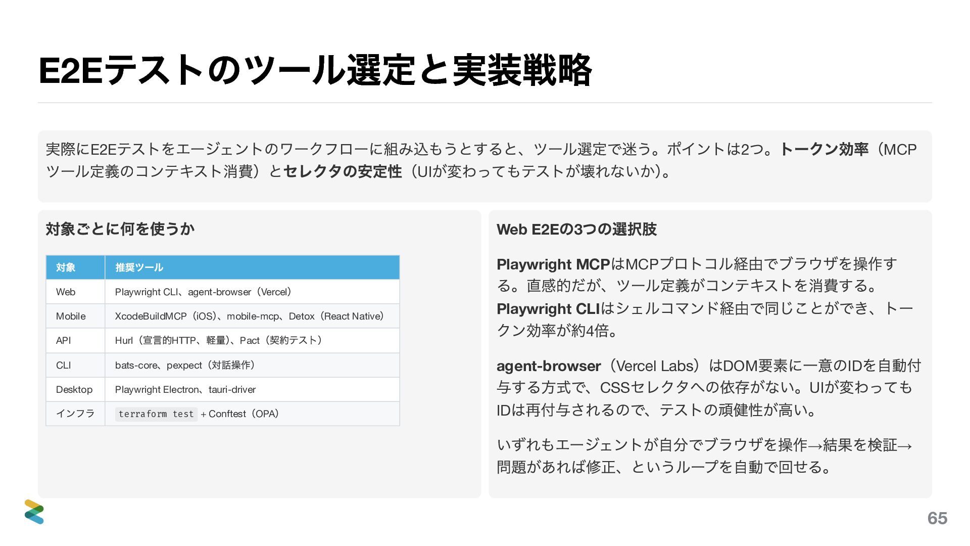 推奨ツール Web Playwright CLI 、agent-browser (Vercel ) Mobile XcodeBuildMCP (iOS ) 、mobile-mcp 、Detox (React Native ) API Hurl (宣言的HTTP 、軽量) 、Pact (契約テスト) CLI bats-core 、pexpect (対話操作) Desktop Playwright Electron 、tauri-driver インフラ terraform test + Conftest (OPA ) Web E2E の3 つの選択肢 Playwright MCP はMCP プロトコル経由でブラウザを操作す る。直感的だが、ツール定義がコンテキストを消費する。 Playwright CLI はシェルコマンド経由で同じことができ、トー クン効率が約4 倍。 agent-browser (Vercel Labs )はDOM 要素に一意のID を自動付 与する方式で、CSS セレクタへの依存がない。UI が変わっても ID は再付与されるので、テストの頑健性が高い。 いずれもエージェントが自分でブラウザを操作→ 結果を検証→ 問題があれば修正、というループを自動で回せる。 65