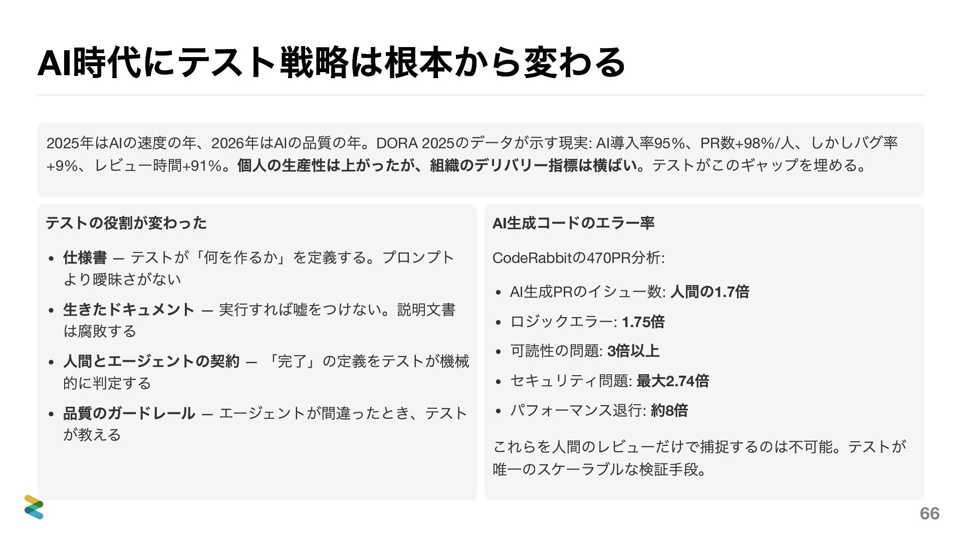 導入率95% 、PR 数+98%/ 人、しかしバグ率 +9% 、レビュー時間+91% 。個人の生産性は上がったが、組織のデリバリー指標は横ばい。テストがこのギャップを埋める。 テストの役割が変わった 仕様書 — テストが「何を作るか」を定義する。プロンプト より曖昧さがない 生きたドキュメント — 実行すれば嘘をつけない。説明文書 は腐敗する 人間とエージェントの契約 — 「完了」の定義をテストが機械 的に判定する 品質のガードレール — エージェントが間違ったとき、テスト が教える AI 生成コードのエラー率 CodeRabbit の470PR 分析: AI 生成PR のイシュー数: 人間の1.7 倍 ロジックエラー: 1.75 倍 可読性の問題: 3 倍以上 セキュリティ問題: 最大2.74 倍 パフォーマンス退行: 約8 倍 これらを人間のレビューだけで捕捉するのは不可能。テストが 唯一のスケーラブルな検証手段。 66