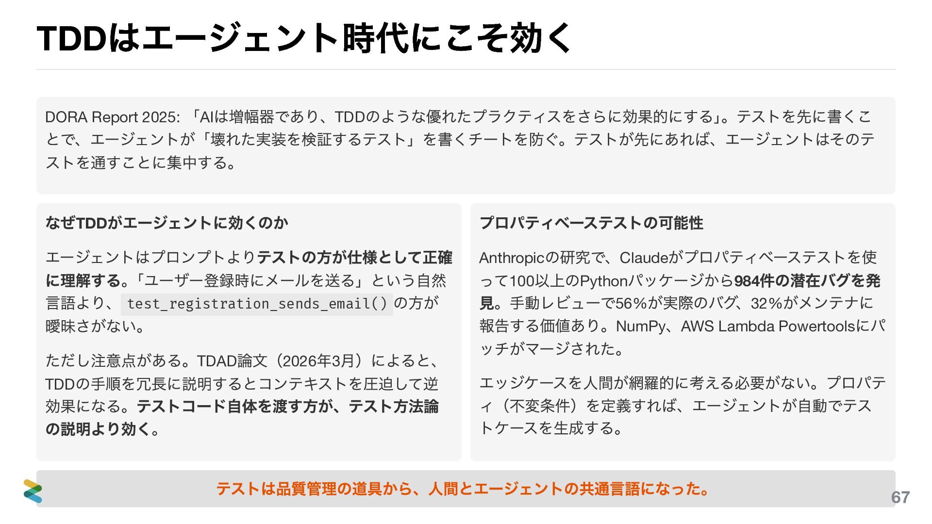 ストを通すことに集中する。 なぜTDD がエージェントに効くのか エージェントはプロンプトよりテストの方が仕様として正確 に理解する。 「ユーザー登録時にメールを送る」という自然 言語より、 test_registration_sends_email() の方が 曖昧さがない。 ただし注意点がある。TDAD 論文(2026 年3 月)によると、 TDD の手順を冗長に説明するとコンテキストを圧迫して逆 効果になる。テストコード自体を渡す方が、テスト方法論 の説明より効く。 プロパティベーステストの可能性 Anthropic の研究で、Claude がプロパティベーステストを使 って100 以上のPython パッケージから984 件の潜在バグを発 見。手動レビューで56% が実際のバグ、32% がメンテナに 報告する価値あり。NumPy 、AWS Lambda Powertools にパ ッチがマージされた。 エッジケースを人間が網羅的に考える必要がない。プロパテ ィ(不変条件)を定義すれば、エージェントが自動でテス トケースを生成する。 テストは品質管理の道具から、人間とエージェントの共通言語になった。 67