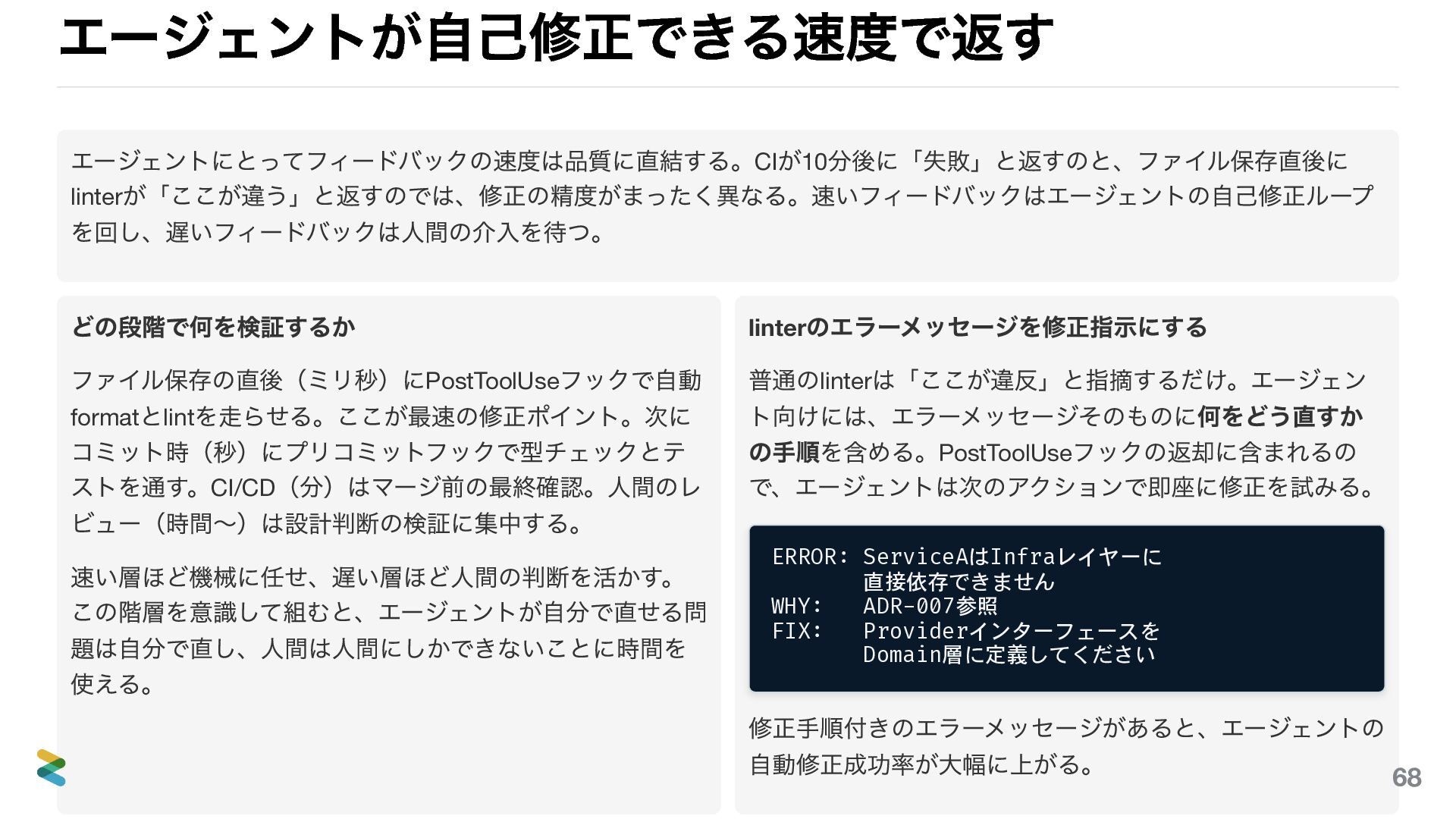 format とlint を走らせる。ここが最速の修正ポイント。次に コミット時(秒)にプリコミットフックで型チェックとテ ストを通す。CI/CD (分)はマージ前の最終確認。人間のレ ビュー(時間〜)は設計判断の検証に集中する。 速い層ほど機械に任せ、遅い層ほど人間の判断を活かす。 この階層を意識して組むと、エージェントが自分で直せる問 題は自分で直し、人間は人間にしかできないことに時間を 使える。 linter のエラーメッセージを修正指示にする 普通のlinter は「ここが違反」と指摘するだけ。エージェン ト向けには、エラーメッセージそのものに何をどう直すか の手順を含める。PostToolUse フックの返却に含まれるの で、エージェントは次のアクションで即座に修正を試みる。 ERROR: ServiceAはInfraレイヤーに 直接依存できません WHY: ADR-007参照 FIX: Providerインターフェースを Domain層に定義してください 修正手順付きのエラーメッセージがあると、エージェントの 自動修正成功率が大幅に上がる。 68