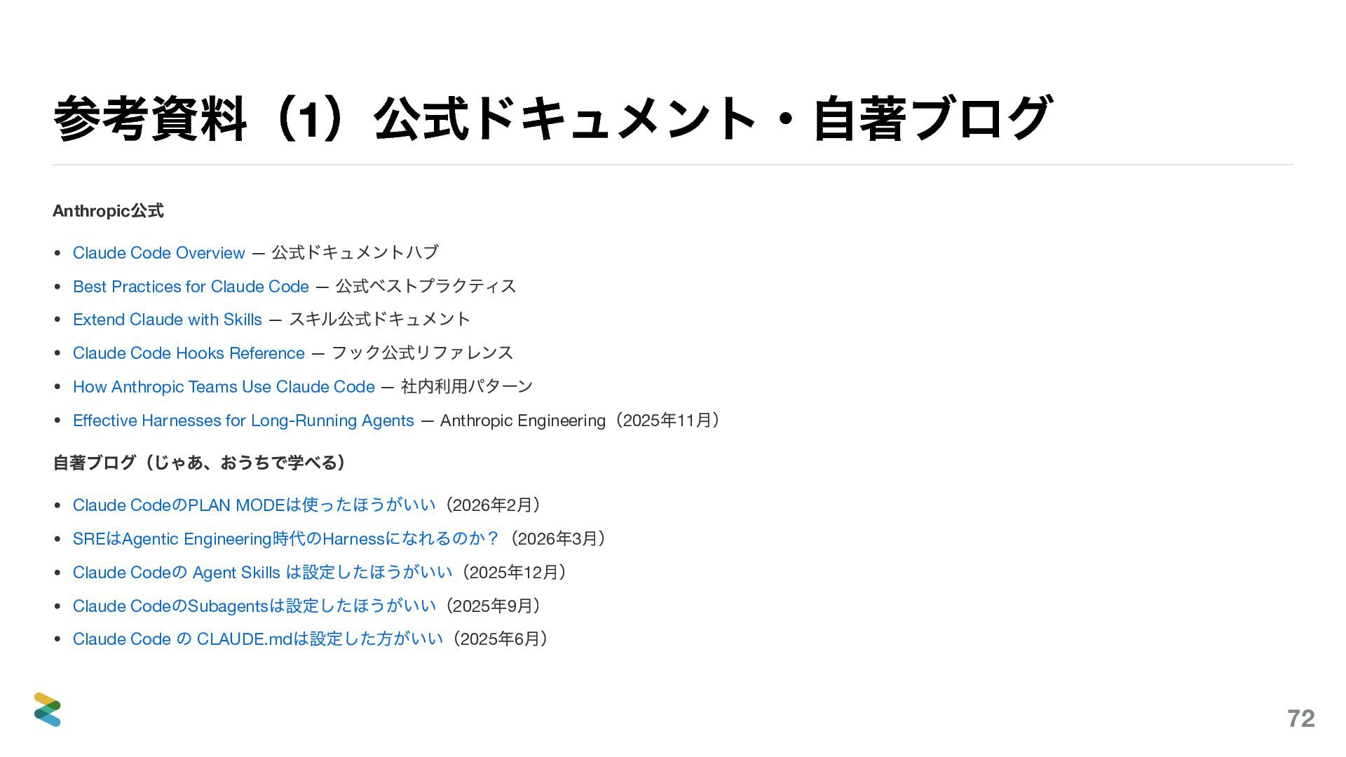 Practices for Claude Code — 公式ベストプラクティス Extend Claude with Skills — スキル公式ドキュメント Claude Code Hooks Reference — フック公式リファレンス How Anthropic Teams Use Claude Code — 社内利用パターン Effective Harnesses for Long-Running Agents — Anthropic Engineering (2025 年11 月) 自著ブログ(じゃあ、おうちで学べる) Claude Code のPLAN MODE は使ったほうがいい(2026 年2 月) SRE はAgentic Engineering 時代のHarness になれるのか?(2026 年3 月) Claude Code の Agent Skills は設定したほうがいい(2025 年12 月) Claude Code のSubagents は設定したほうがいい(2025 年9 月) Claude Code の CLAUDE.md は設定した方がいい(2025 年6 月) 72