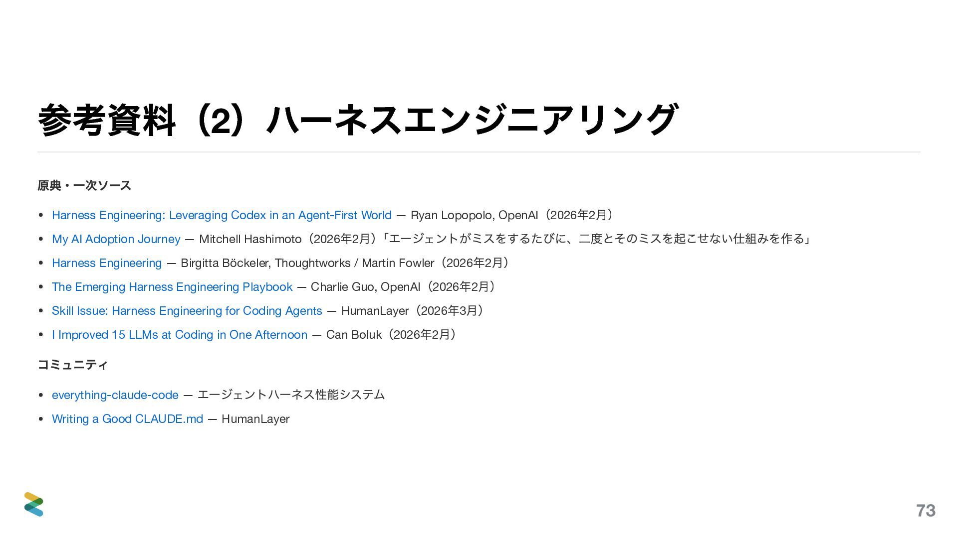 World — Ryan Lopopolo, OpenAI (2026 年2 月) My AI Adoption Journey — Mitchell Hashimoto (2026 年2 月) 「エージェントがミスをするたびに、二度とそのミスを起こせない仕組みを作る」 Harness Engineering — Birgitta Böckeler, Thoughtworks / Martin Fowler (2026 年2 月) The Emerging Harness Engineering Playbook — Charlie Guo, OpenAI (2026 年2 月) Skill Issue: Harness Engineering for Coding Agents — HumanLayer (2026 年3 月) I Improved 15 LLMs at Coding in One Afternoon — Can Boluk (2026 年2 月) コミュニティ everything-claude-code — エージェントハーネス性能システム Writing a Good CLAUDE.md — HumanLayer 73