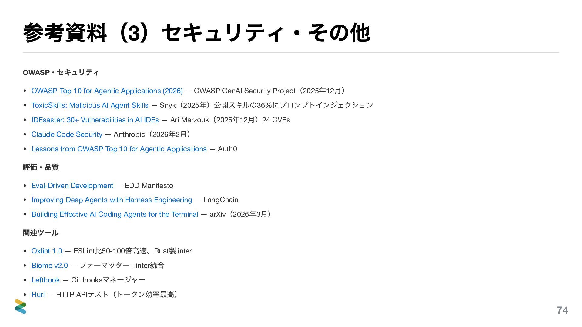 (2026) — OWASP GenAI Security Project (2025 年12 月) ToxicSkills: Malicious AI Agent Skills — Snyk (2025 年)公開スキルの36% にプロンプトインジェクション IDEsaster: 30+ Vulnerabilities in AI IDEs — Ari Marzouk (2025 年12 月)24 CVEs Claude Code Security — Anthropic (2026 年2 月) Lessons from OWASP Top 10 for Agentic Applications — Auth0 評価・品質 Eval-Driven Development — EDD Manifesto Improving Deep Agents with Harness Engineering — LangChain Building Effective AI Coding Agents for the Terminal — arXiv (2026 年3 月) 関連ツール Oxlint 1.0 — ESLint 比50-100 倍高速、Rust 製linter Biome v2.0 — フォーマッター+linter 統合 Lefthook — Git hooks マネージャー Hurl — HTTP API テスト(トークン効率最高) 74