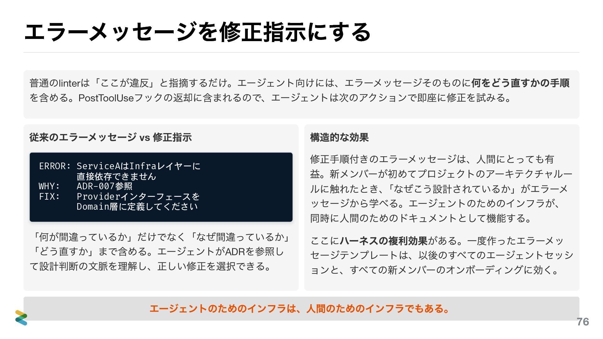 直接依存できません WHY: ADR-007参照 FIX: Providerインターフェースを Domain層に定義してください 「何が間違っているか」だけでなく「なぜ間違っているか」 「どう直すか」まで含める。エージェントがADR を参照し て設計判断の文脈を理解し、正しい修正を選択できる。 構造的な効果 修正手順付きのエラーメッセージは、人間にとっても有 益。新メンバーが初めてプロジェクトのアーキテクチャルー ルに触れたとき、 「なぜこう設計されているか」がエラーメ ッセージから学べる。エージェントのためのインフラが、 同時に人間のためのドキュメントとして機能する。 ここにハーネスの複利効果がある。一度作ったエラーメッ セージテンプレートは、以後のすべてのエージェントセッシ ョンと、すべての新メンバーのオンボーディングに効く。 エージェントのためのインフラは、人間のためのインフラでもある。 76