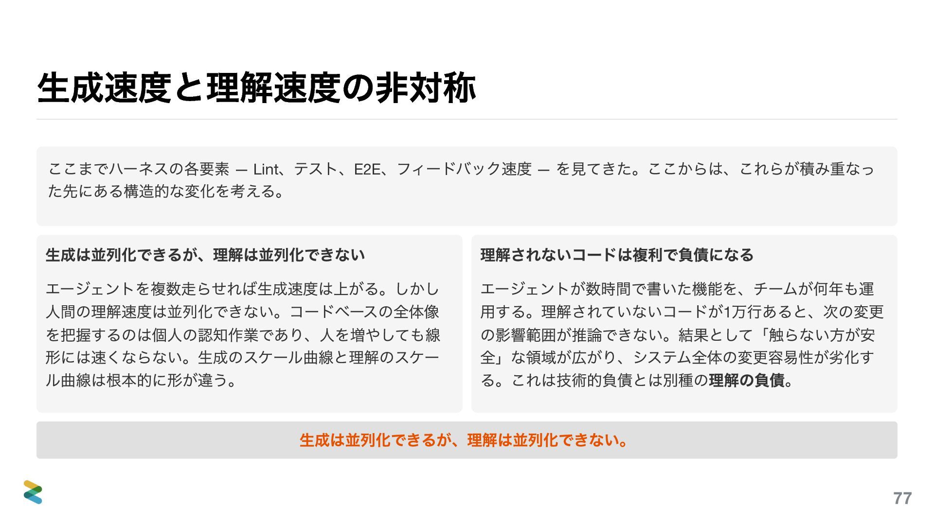 生成速度と理解速度の非対称 ここまでハーネスの各要素 — Lint 、テスト、E2E 、フィードバック速度 — を見てきた。ここからは、これらが積み重なっ た先にある構造的な変化を考える。 生成は並列化できるが、理解は並列化できない