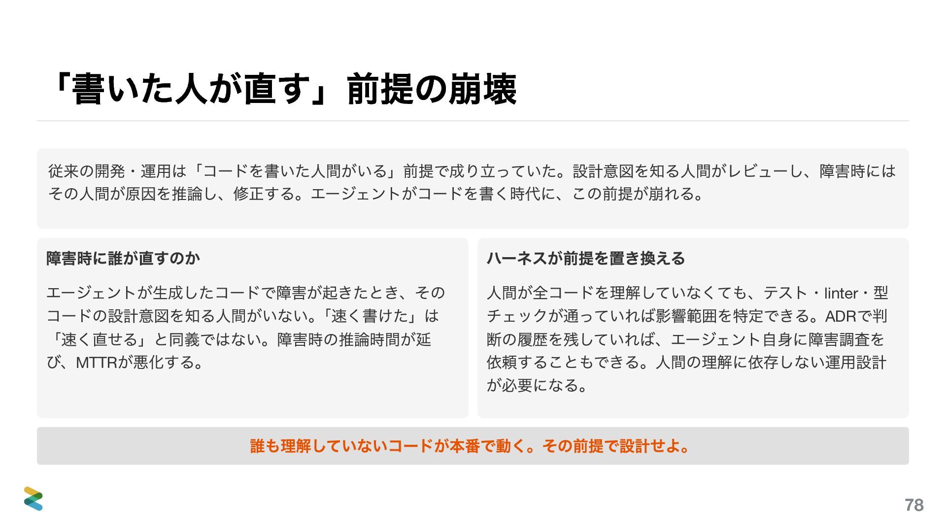 ハーネスが前提を置き換える 人間が全コードを理解していなくても、テスト・linter ・型 チェックが通っていれば影響範囲を特定できる。ADR で判 断の履歴を残していれば、エージェント自身に障害調査を 依頼することもできる。人間の理解に依存しない運用設計 が必要になる。 誰も理解していないコードが本番で動く。その前提で設計せよ。 78