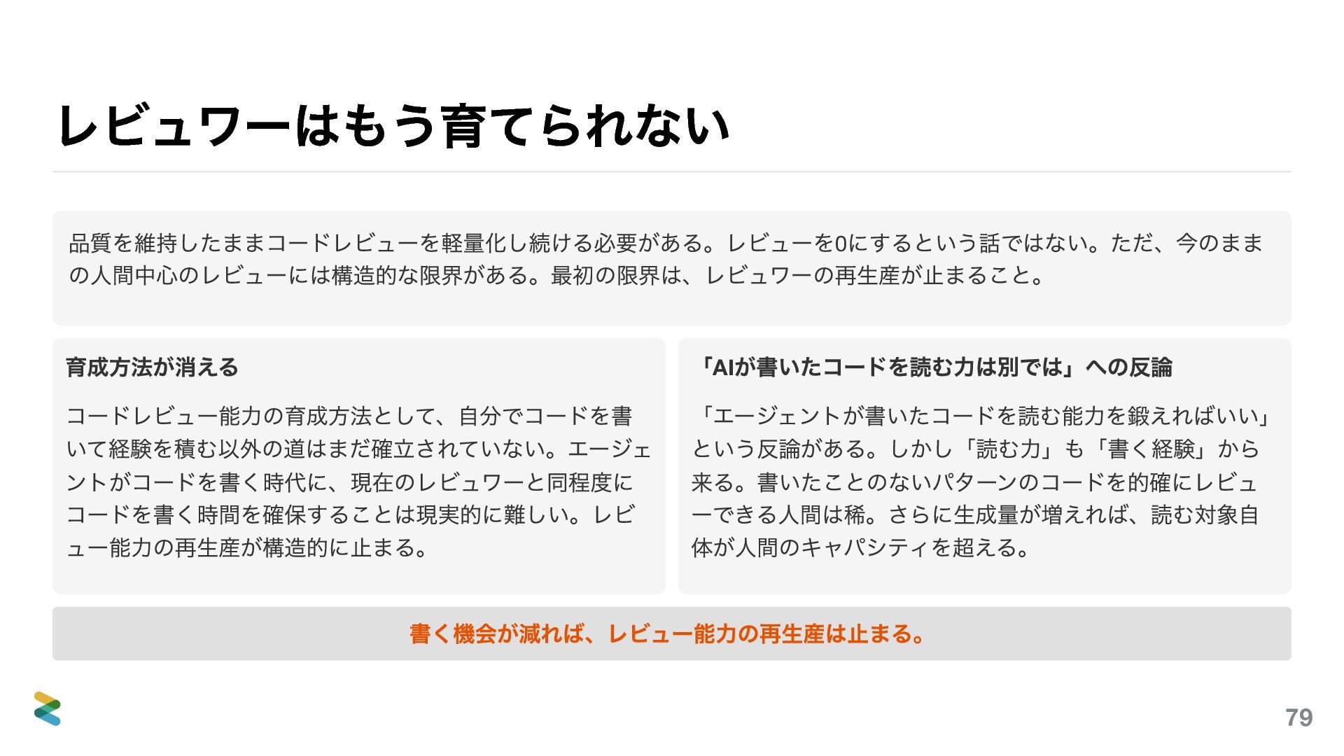 「AI が書いたコードを読む力は別では」への反論 「エージェントが書いたコードを読む能力を鍛えればいい」 という反論がある。しかし「読む力」も「書く経験」から 来る。書いたことのないパターンのコードを的確にレビュ ーできる人間は稀。さらに生成量が増えれば、読む対象自 体が人間のキャパシティを超える。 書く機会が減れば、レビュー能力の再生産は止まる。 79