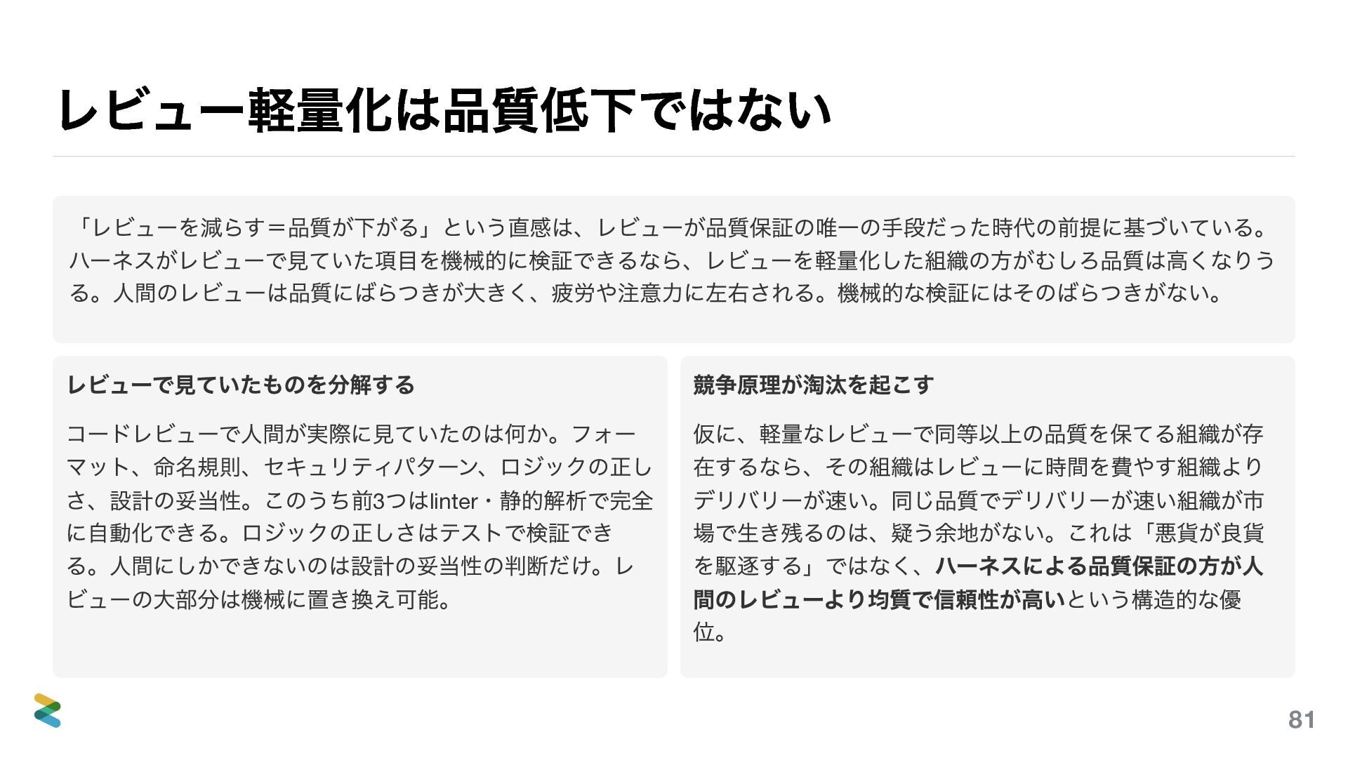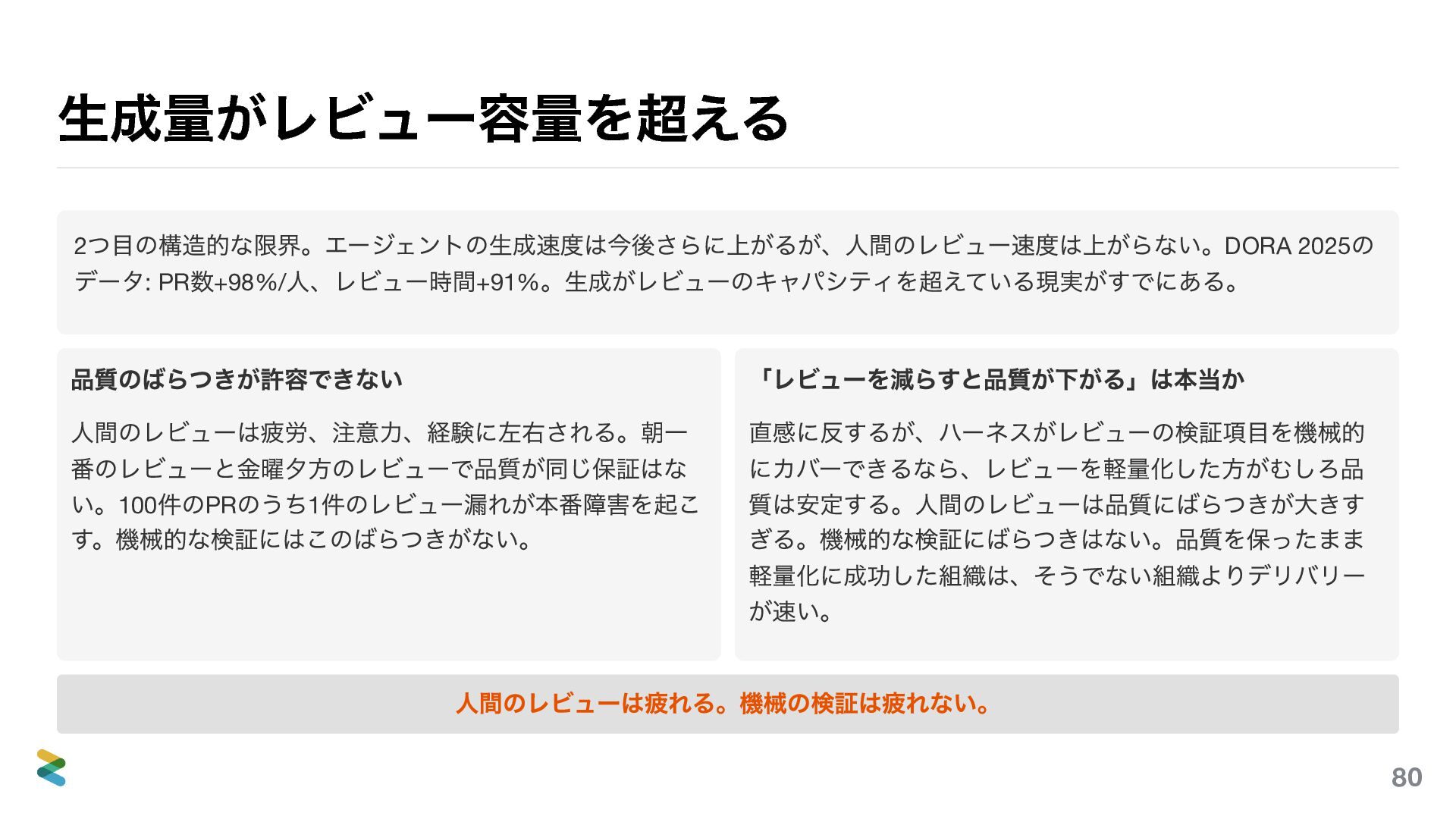 品質のばらつきが許容できない 人間のレビューは疲労、注意力、経験に左右される。朝一 番のレビューと金曜夕方のレビューで品質が同じ保証はな い。100 件のPR のうち1 件のレビュー漏れが本番障害を起こ す。機械的な検証にはこのばらつきがない。 「レビューを減らすと品質が下がる」は本当か 直感に反するが、ハーネスがレビューの検証項目を機械的 にカバーできるなら、レビューを軽量化した方がむしろ品 質は安定する。人間のレビューは品質にばらつきが大きす ぎる。機械的な検証にばらつきはない。品質を保ったまま 軽量化に成功した組織は、そうでない組織よりデリバリー が速い。 人間のレビューは疲れる。機械の検証は疲れない。 80