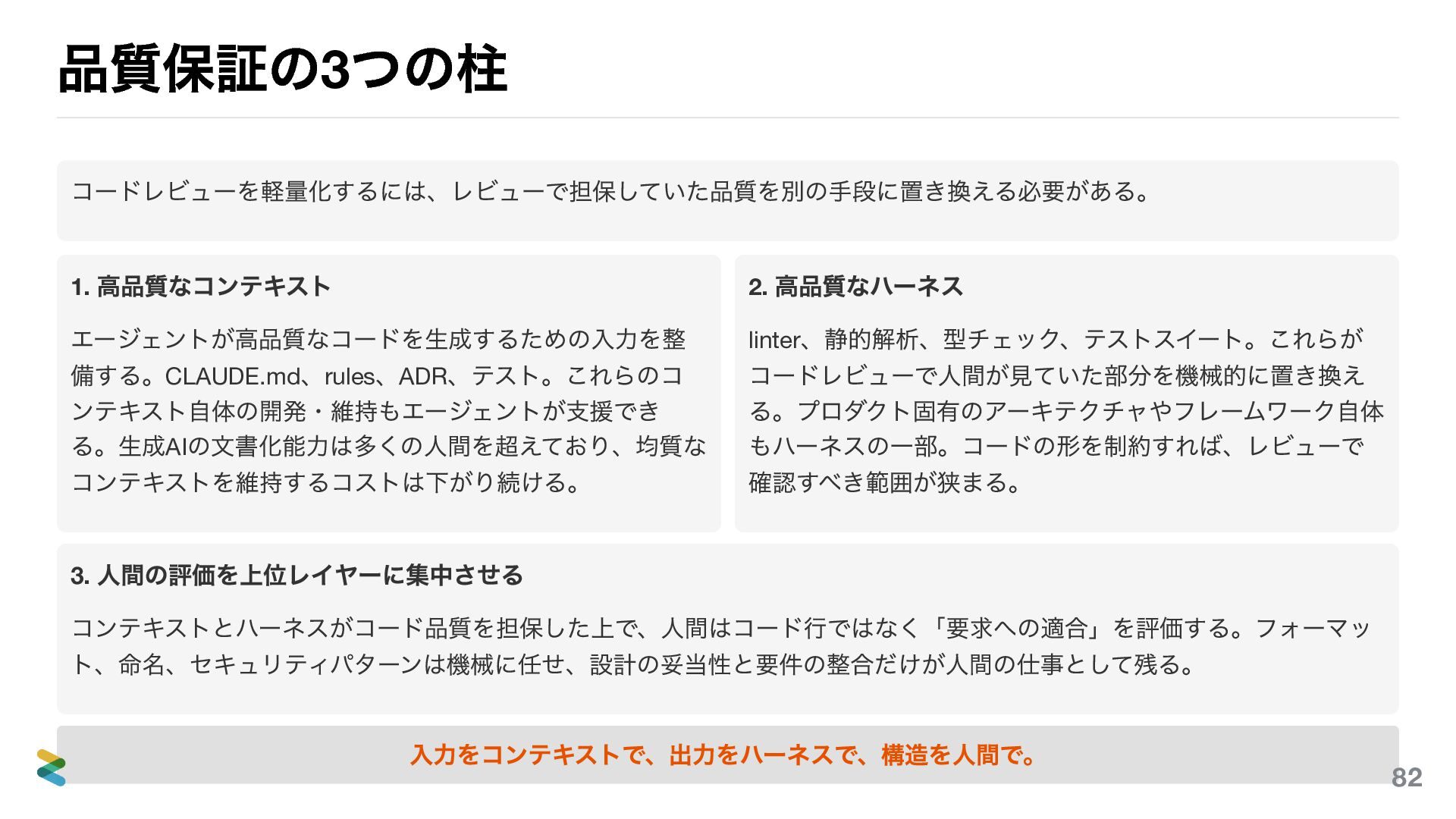 品質保証の3 つの柱 コードレビューを軽量化するには、レビューで担保していた品質を別の手段に置き換える必要がある。 1. 高品質なコンテキスト エージェントが高品質なコードを生成するための入力を整 備する。CLAUDE.md 、rules 、ADR 、テスト。これらのコ