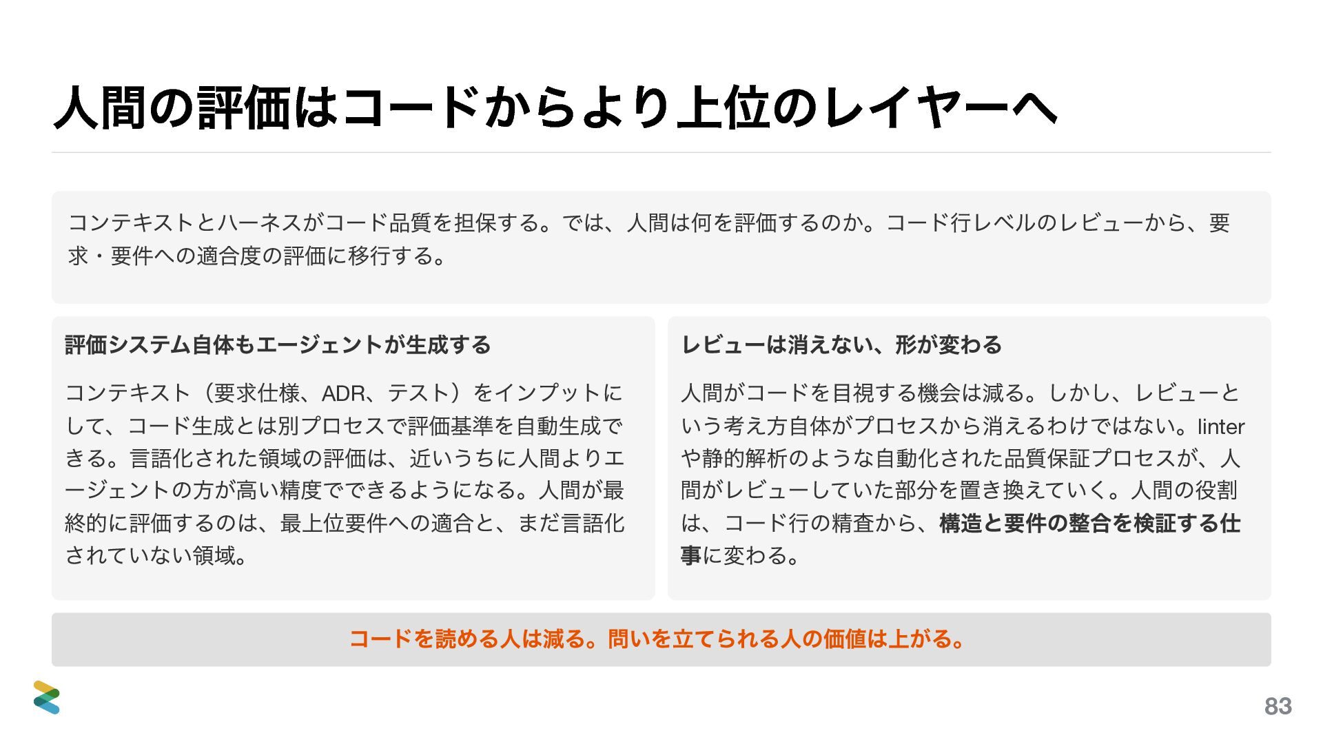 されていない領域。 レビューは消えない、形が変わる 人間がコードを目視する機会は減る。しかし、レビューと いう考え方自体がプロセスから消えるわけではない。linter や静的解析のような自動化された品質保証プロセスが、人 間がレビューしていた部分を置き換えていく。人間の役割 は、コード行の精査から、構造と要件の整合を検証する仕 事に変わる。 コードを読める人は減る。問いを立てられる人の価値は上がる。 83