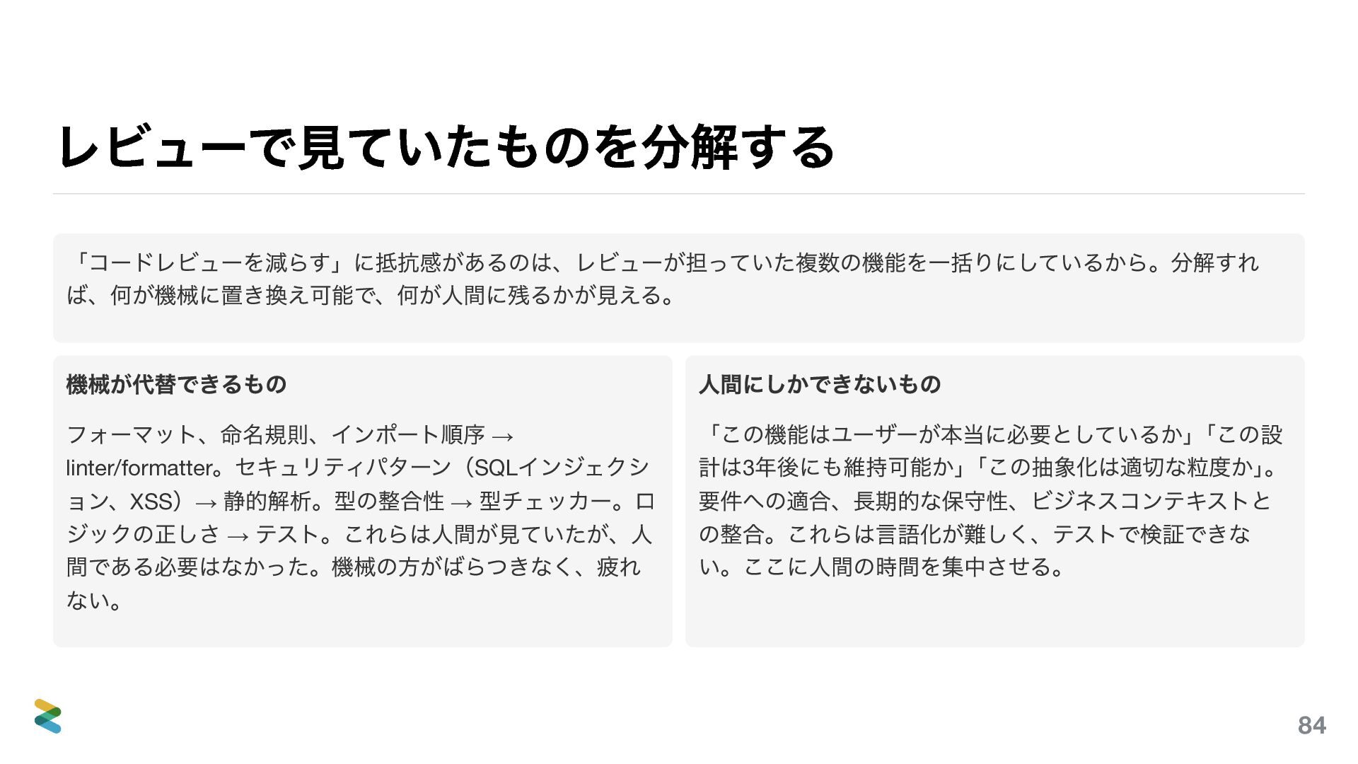 )→ 静的解析。型の整合性 → 型チェッカー。ロ ジックの正しさ → テスト。これらは人間が見ていたが、人 間である必要はなかった。機械の方がばらつきなく、疲れ ない。 人間にしかできないもの 「この機能はユーザーが本当に必要としているか」 「この設 計は3 年後にも維持可能か」 「この抽象化は適切な粒度か」 。 要件への適合、長期的な保守性、ビジネスコンテキストと の整合。これらは言語化が難しく、テストで検証できな い。ここに人間の時間を集中させる。 84