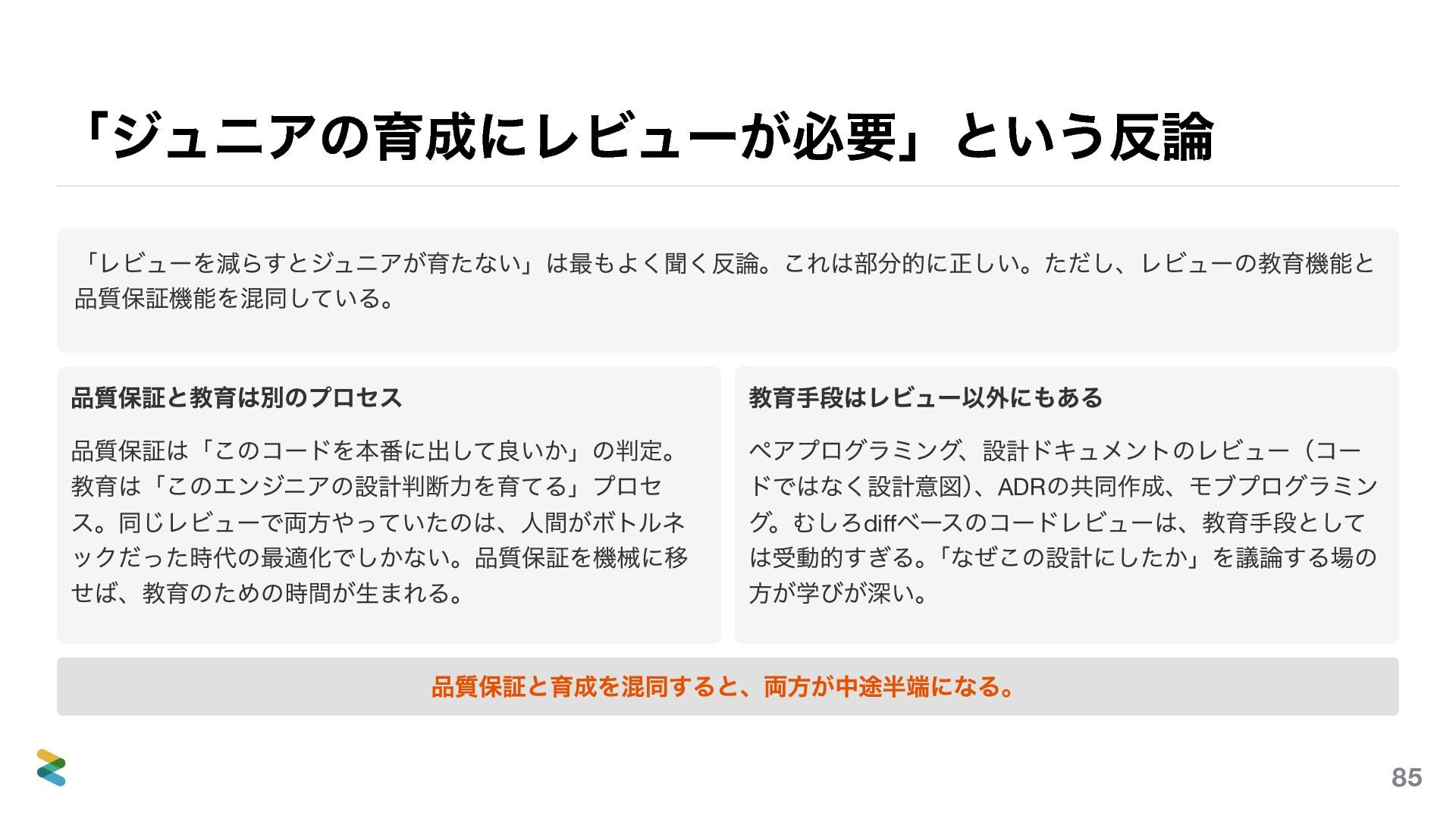 ペアプログラミング、設計ドキュメントのレビュー(コー ドではなく設計意図) 、ADR の共同作成、モブプログラミン グ。むしろdiff ベースのコードレビューは、教育手段として は受動的すぎる。 「なぜこの設計にしたか」を議論する場の 方が学びが深い。 品質保証と育成を混同すると、両方が中途半端になる。 85