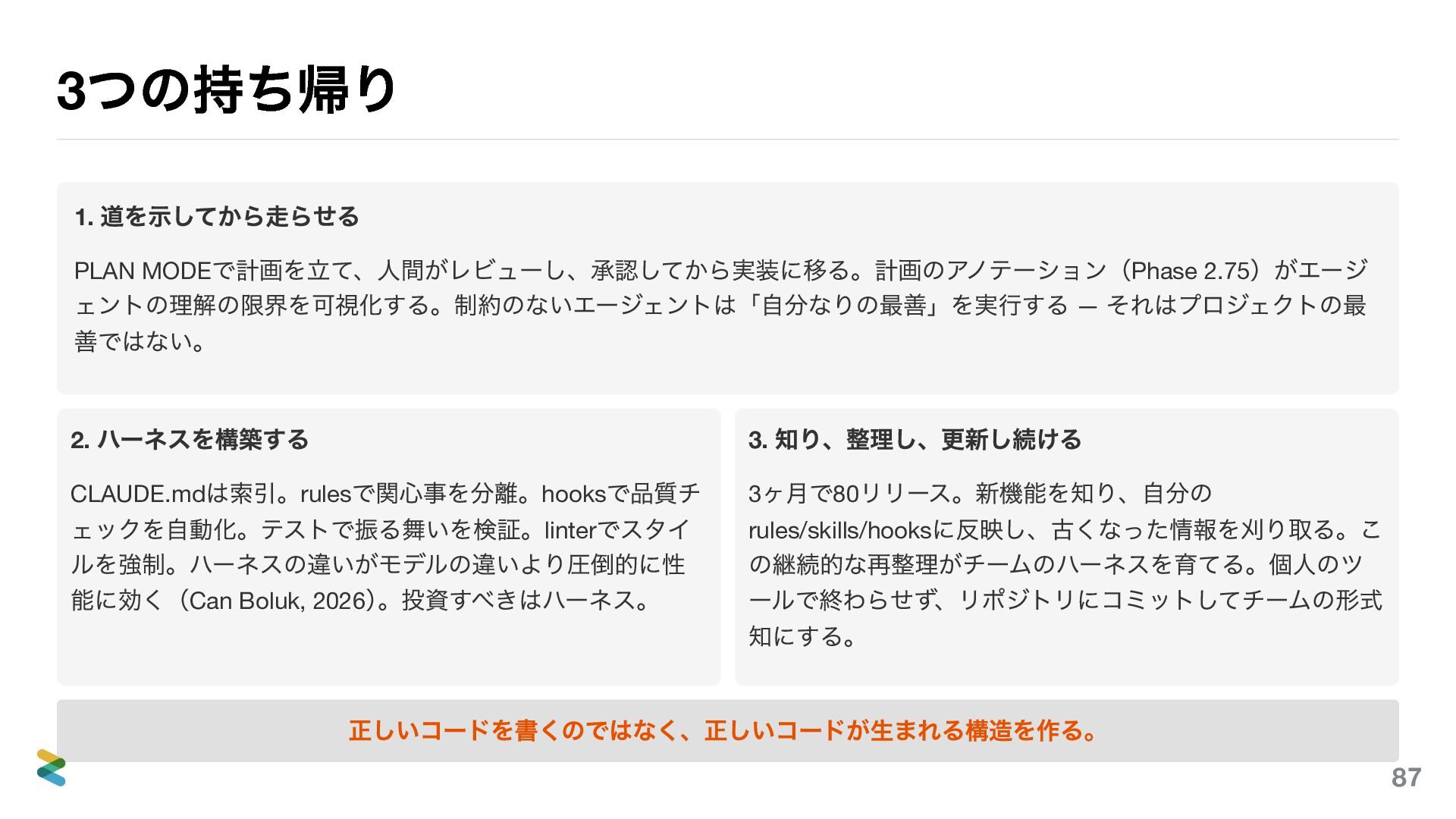 — それはプロジェクトの最 善ではない。 2. ハーネスを構築する CLAUDE.md は索引。rules で関心事を分離。hooks で品質チ ェックを自動化。テストで振る舞いを検証。linter でスタイ ルを強制。ハーネスの違いがモデルの違いより圧倒的に性 能に効く(Can Boluk, 2026 ) 。投資すべきはハーネス。 3. 知り、整理し、更新し続ける 3 ヶ月で80 リリース。新機能を知り、自分の rules/skills/hooks に反映し、古くなった情報を刈り取る。こ の継続的な再整理がチームのハーネスを育てる。個人のツ ールで終わらせず、リポジトリにコミットしてチームの形式 知にする。 正しいコードを書くのではなく、正しいコードが生まれる構造を作る。 87