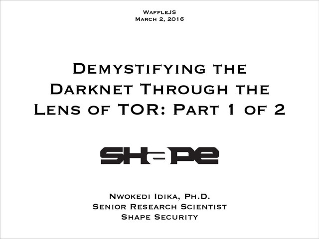 Abstract: This talk will explain the Darknet through its most popular example: The Onion Router (TOR). With TOR, you can interact with an endpoint that is or isn’t on TOR (e.g., google.com). This talk will focus on the latter. Attendees will leave with a visceral sense of how a central aspect of TOR works.