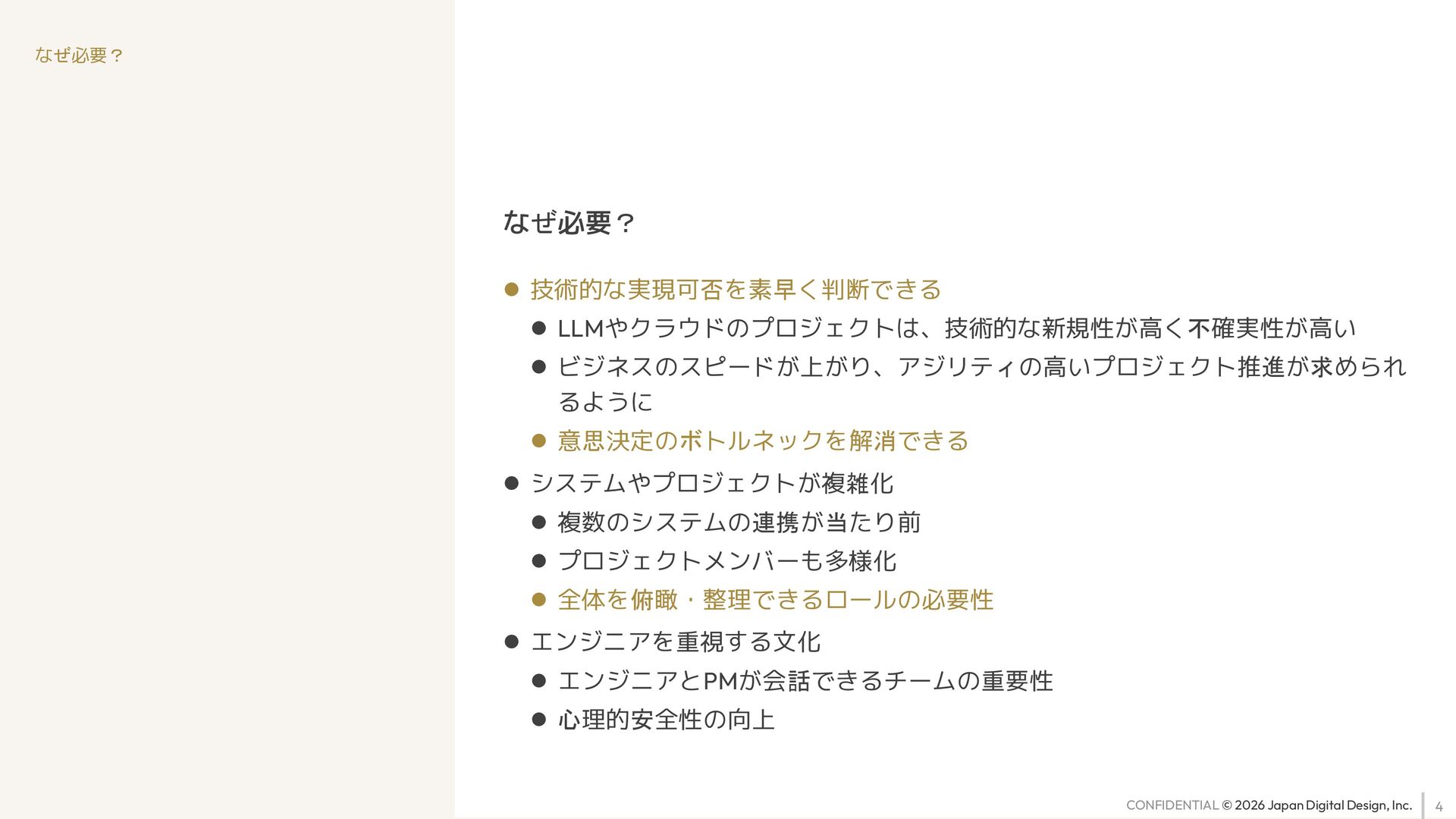 3 © 2026 Japan Digital Design, Inc. ⚫ 技術的な前提や制約に対処しながら要件を整理する ⚫