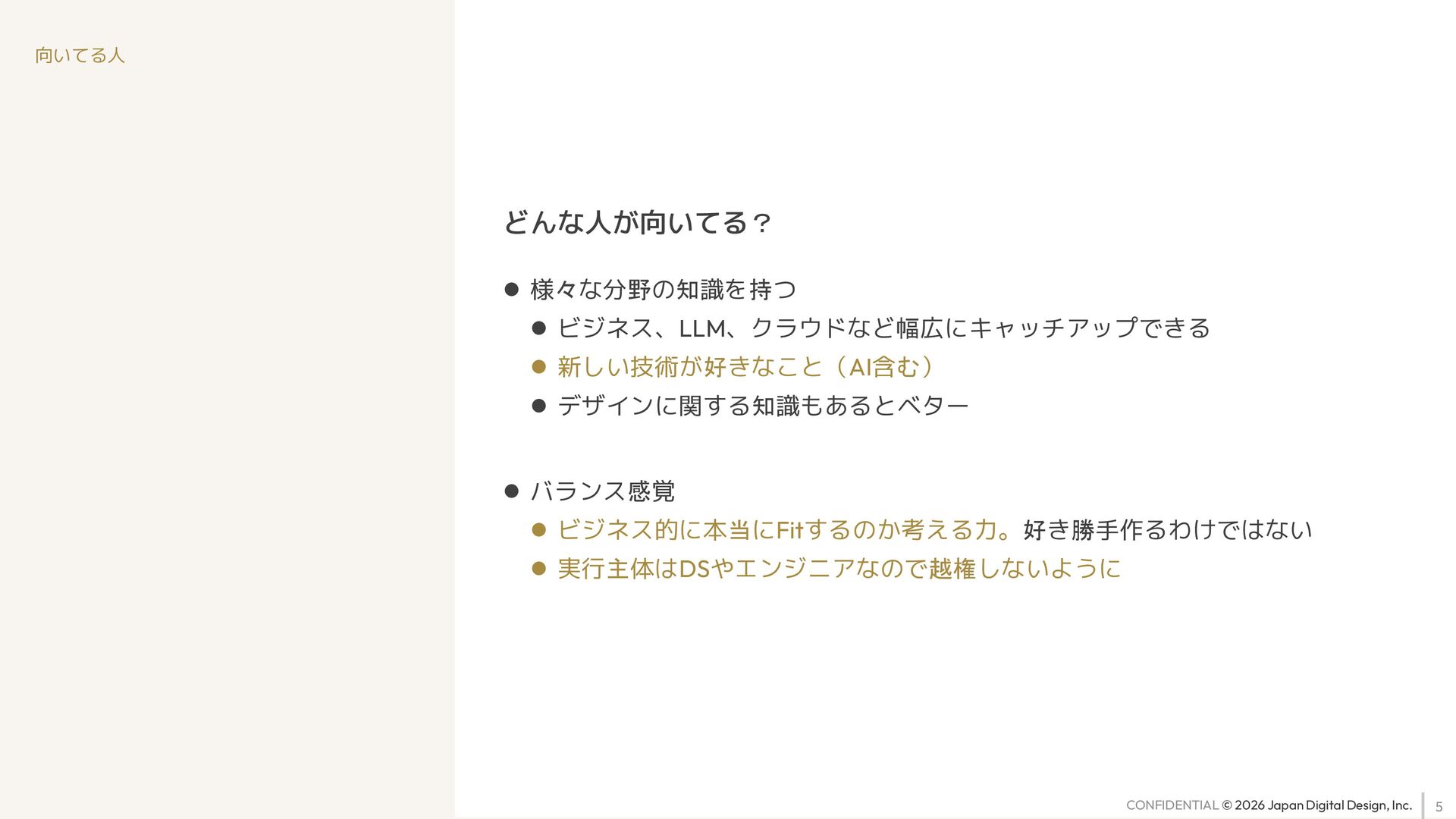 5 CONFIDENTIAL © 2026 Japan Digital Design, Inc. ⚫ 様々な分野の知識を持つ