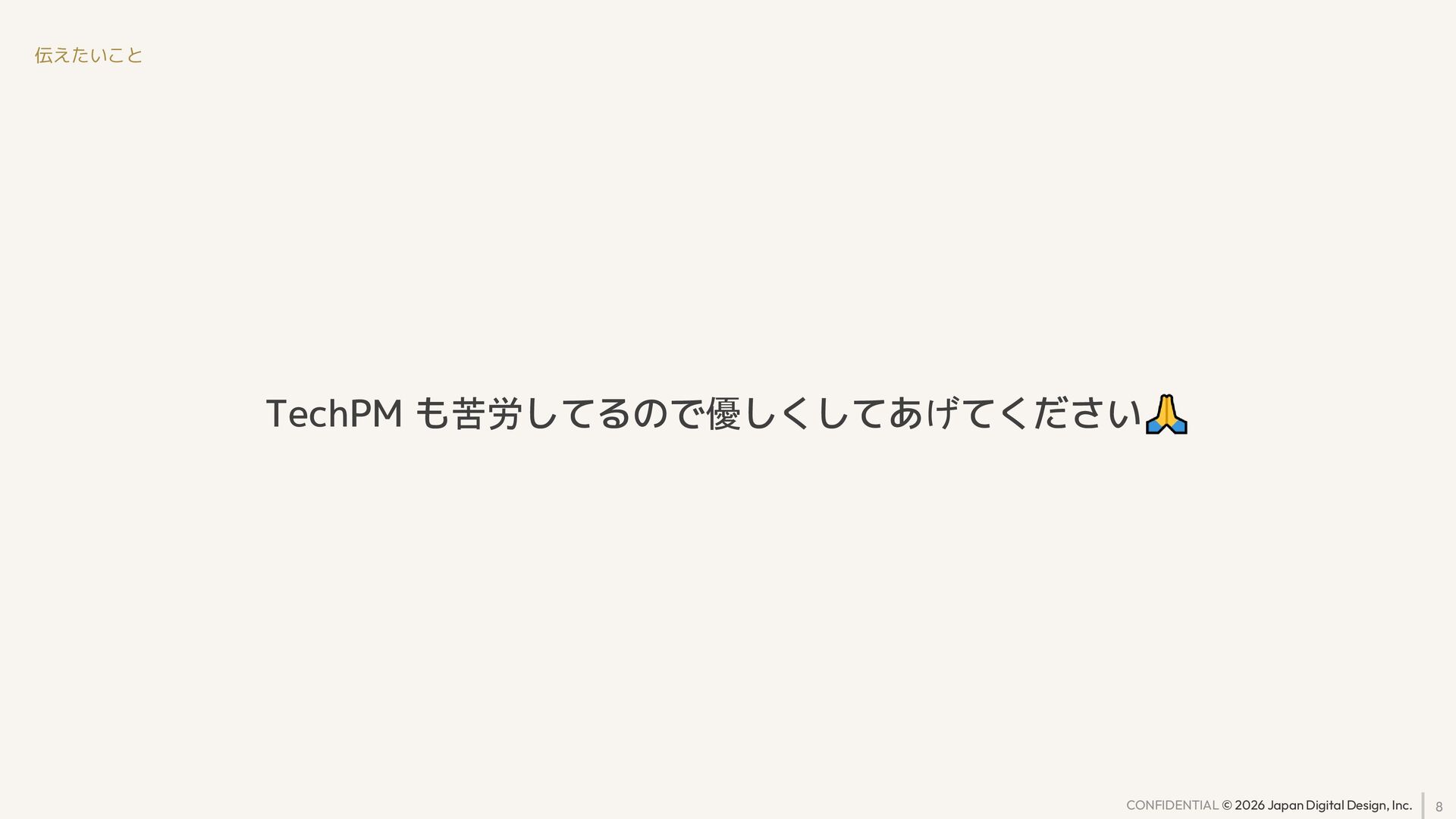 8 CONFIDENTIAL © 2026 Japan Digital Design, Inc. TechPM も苦労してるので優しくしてあげてください