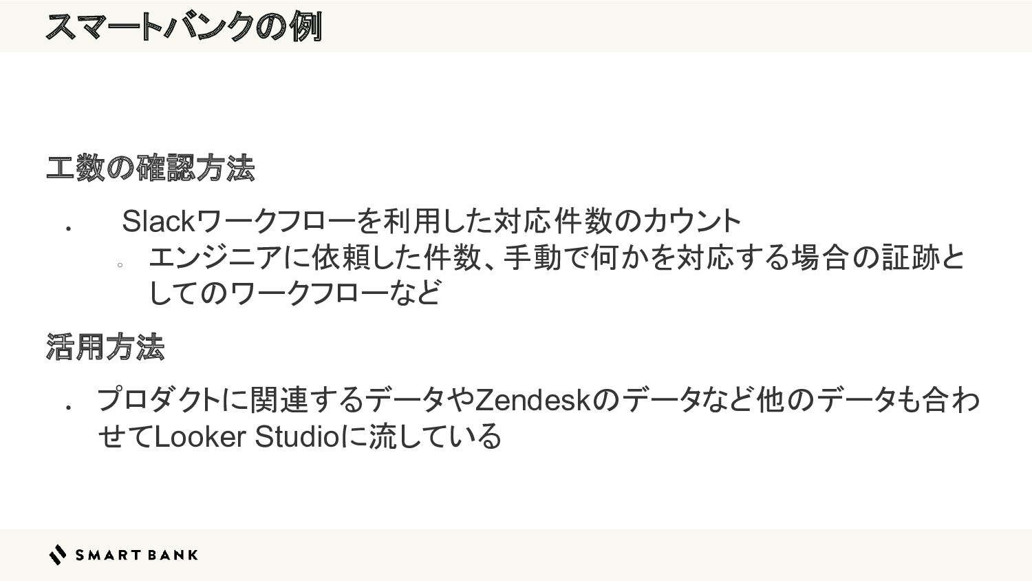 スマートバンクの例 工数の確認方法 • Slackワークフローを利用した対応件数のカウント ◦ エンジニアに依頼した件数、手動で何かを対応する場合の証跡と してのワークフローなど 活用方法 • プロダクトに関連するデータやZendeskのデータなど他のデータも合わ