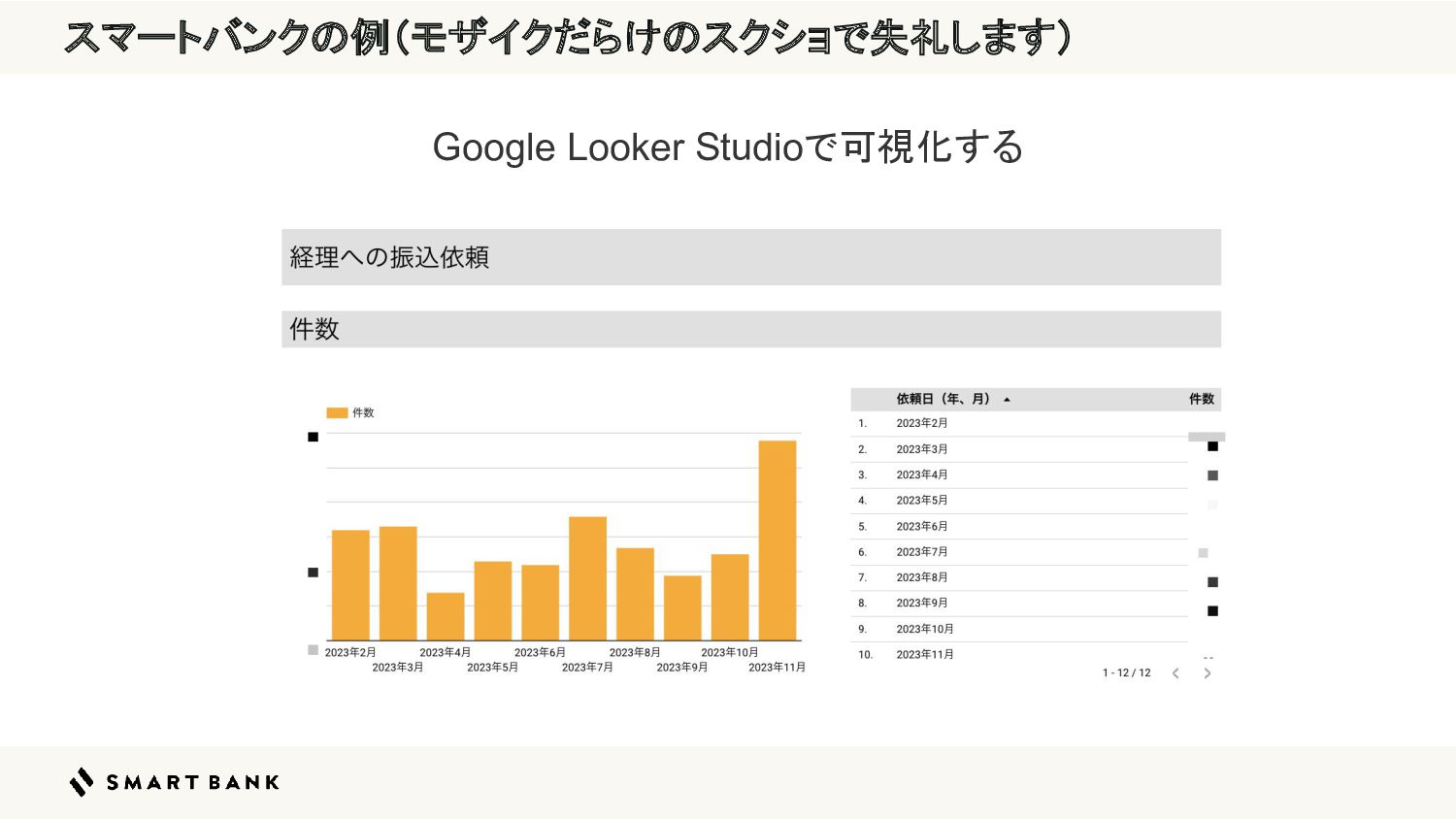 スマートバンクの例(モザイクだらけのスクショで失礼します) Google Looker Studioで可視化する