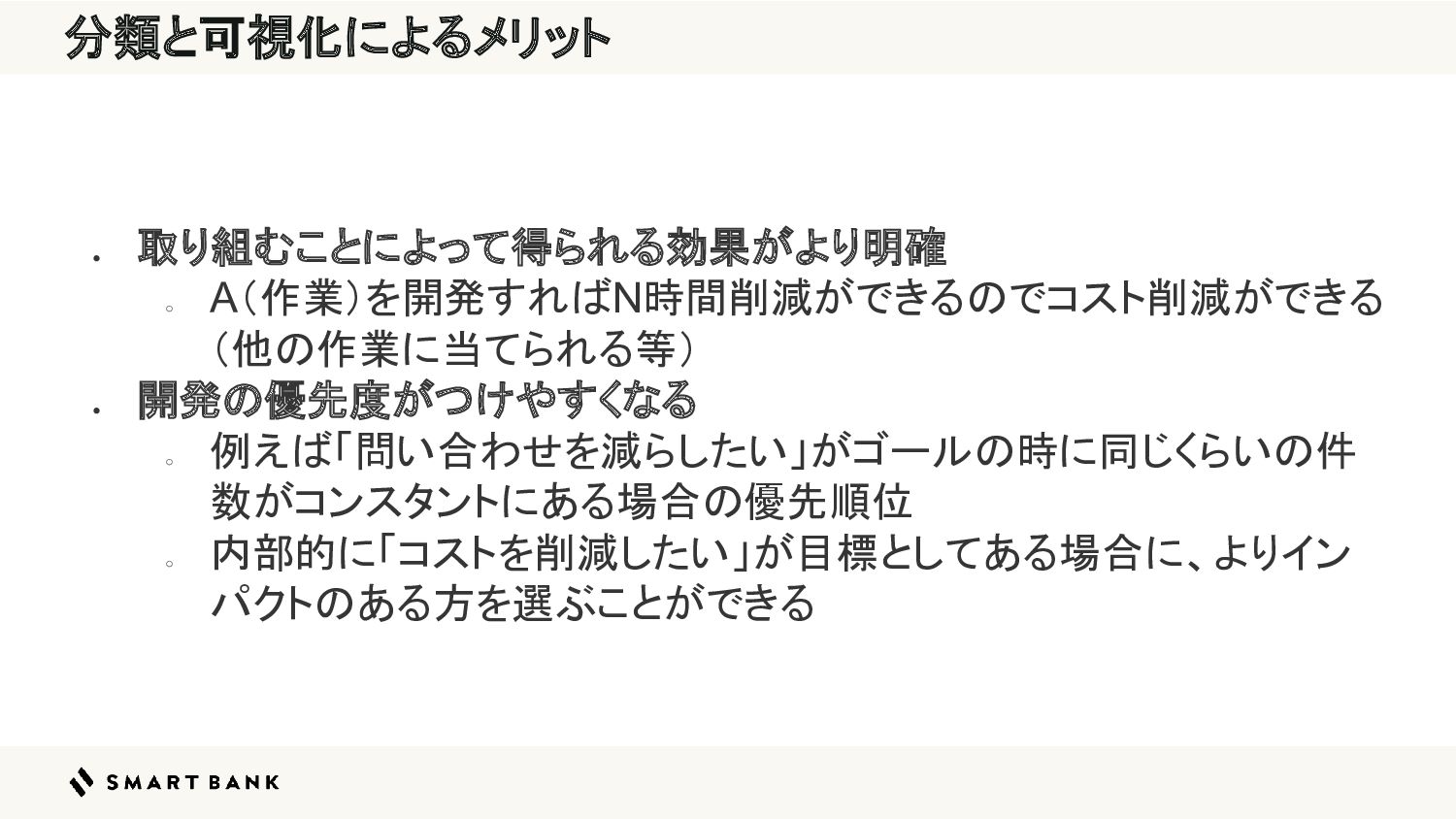 分類と可視化によるメリット • 取り組むことによって得られる効果がより明確 ◦ A(作業)を開発すればN時間削減ができるのでコスト削減ができる (他の作業に当てられる等) • 開発の優先度がつけやすくなる ◦ 例えば「問い合わせを減らしたい」がゴールの時に同じくらいの件
