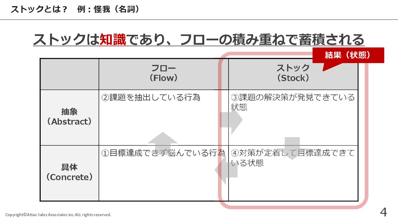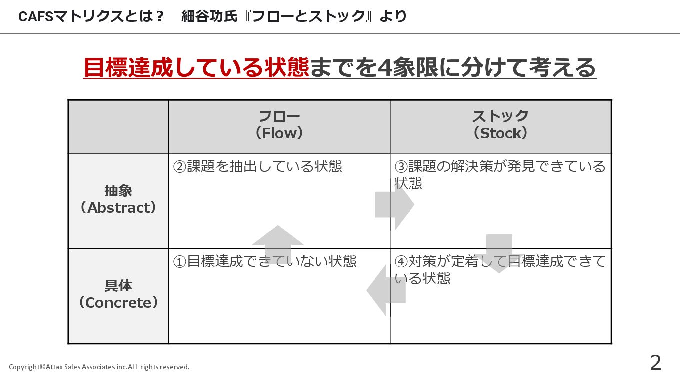 Copyright©Attax Sales Associates inc.ALL rights reserved. 2 CAFSマトリクスとは︖ 細谷功氏『フローとストック』より ストック