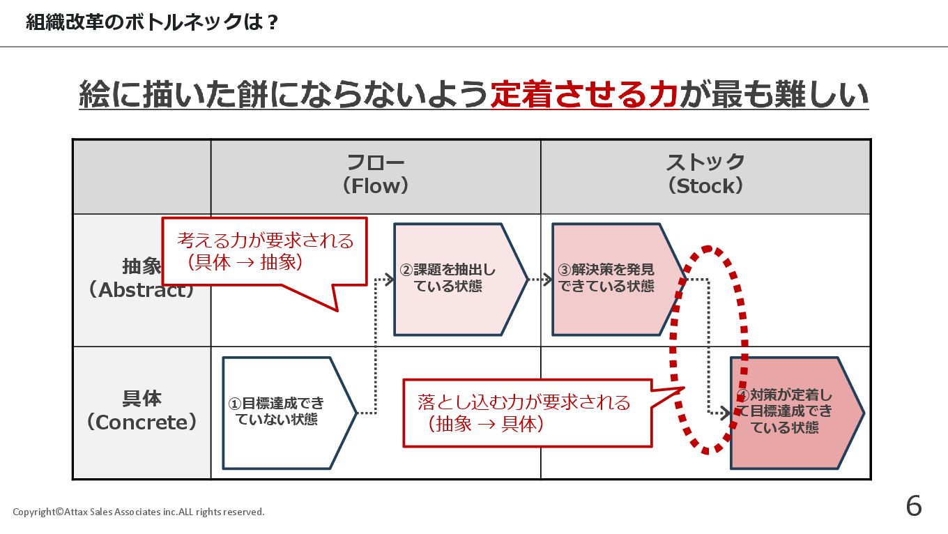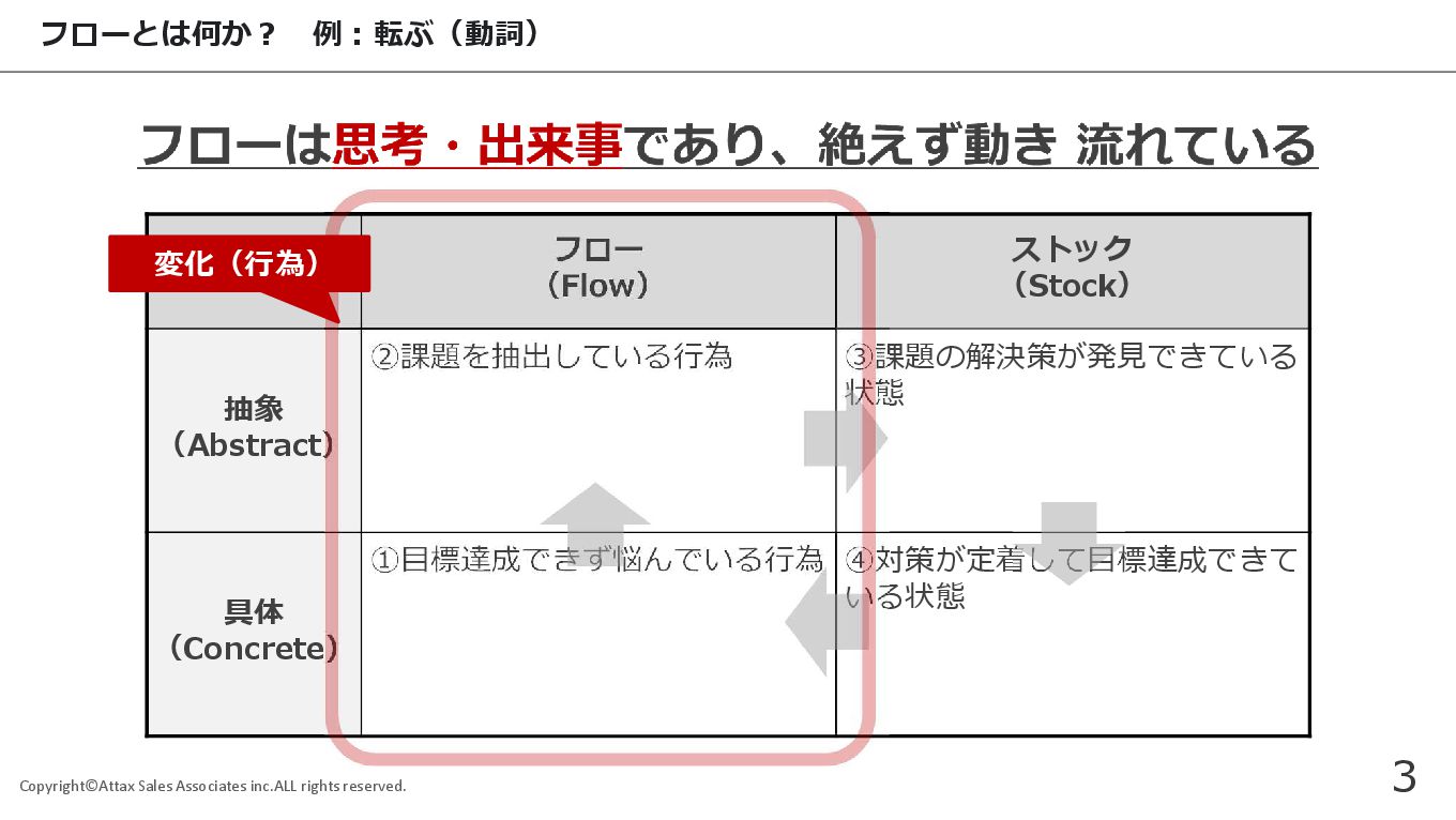 (Stock) フロー (Flow) ③課題の解決策が発⾒できている 状態 ②課題を抽出している⾏為 抽象 (Abstract) ④対策が定着して目標達成できて いる状態 ①目標達成できず悩んでいる⾏為 具体 (Concrete) 変化(⾏為)