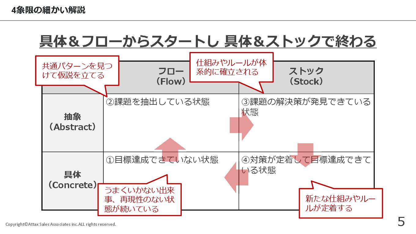 (Stock) フロー (Flow) ③課題の解決策が発⾒できている 状態 ②課題を抽出している状態 抽象 (Abstract) ④対策が定着して目標達成できて いる状態 ①目標達成できていない状態 具体 (Concrete)