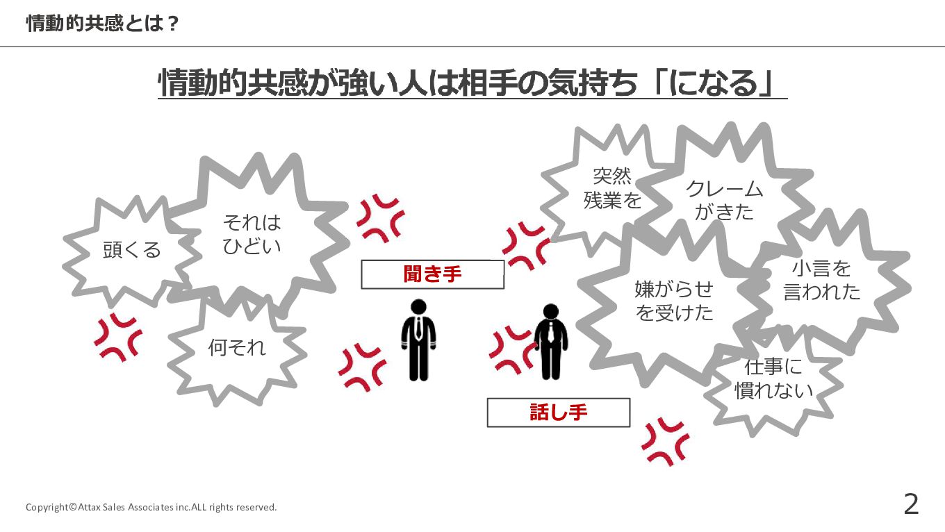 1. 情動的共感とは︖ Copyright©Attax Sales Associates inc.ALL rights reserved. 2 聞き手 話し手