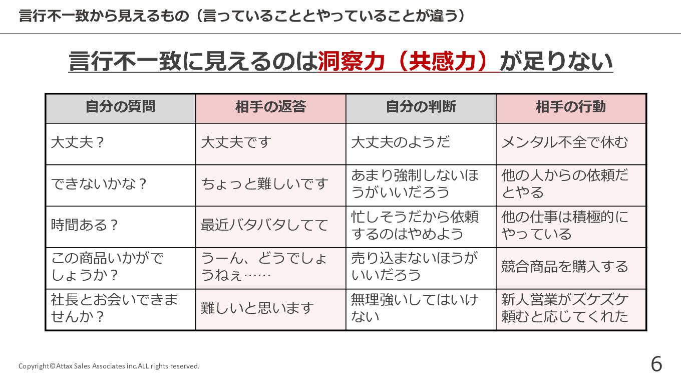 3. ⾔⾏不⼀致から⾒えるもの(⾔っていることとやっていることが違う) Copyright©Attax Sales Associates inc.ALL rights reserved. 6 相手の⾏動 自分の判断