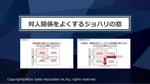 1. ジョハリの窓とは︖ Copyright©Attax Sales Associates inc.ALL rights reserved. 2 盲点の窓 秘密の窓