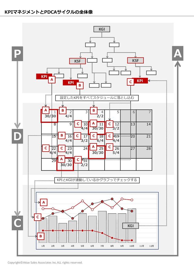 KPI KSF KSF B C A 7 6 5 4 2/2 3 2 4/4 1 30/30 14 13 12 3/2 11 30/30 10 4/4 9 8 21 20 19 4/4 18 6/4 17 3/2 16 4/4 15 28 27 26 5/4 25 30/30 24 23 4/4 22 4/4 31 2/2 30 30/30 29 B C A A A A B B C C C C C C C C 0 2 4 6 8 10 12 14 16 18 20 0 5 10 15 20 25 30 35 40 45 50 1月 2月 3月 4月 5月 6月 7月 8月 9月 10月 11月 12月 A B C KGI P D C A 設定したKPIをすべてスケジュールに落とし込む KPIとKGIが連動しているかグラフっでチェックする