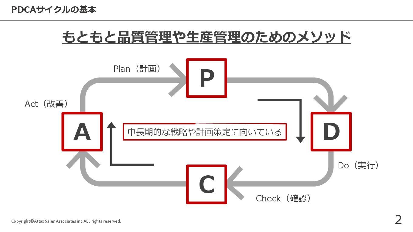 PDCAサイクルの基本 Copyright©Attax Sales Associates inc.ALL rights reserved. 2 Plan(計画) Do(実⾏)