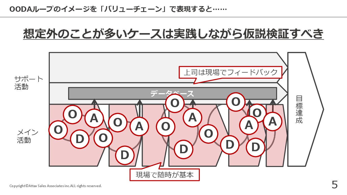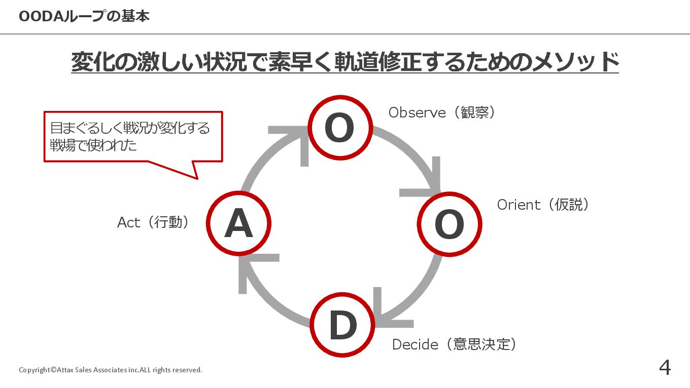 OODAループの基本 Copyright©Attax Sales Associates inc.ALL rights reserved. 4 Observe(観察) Orient(仮説)