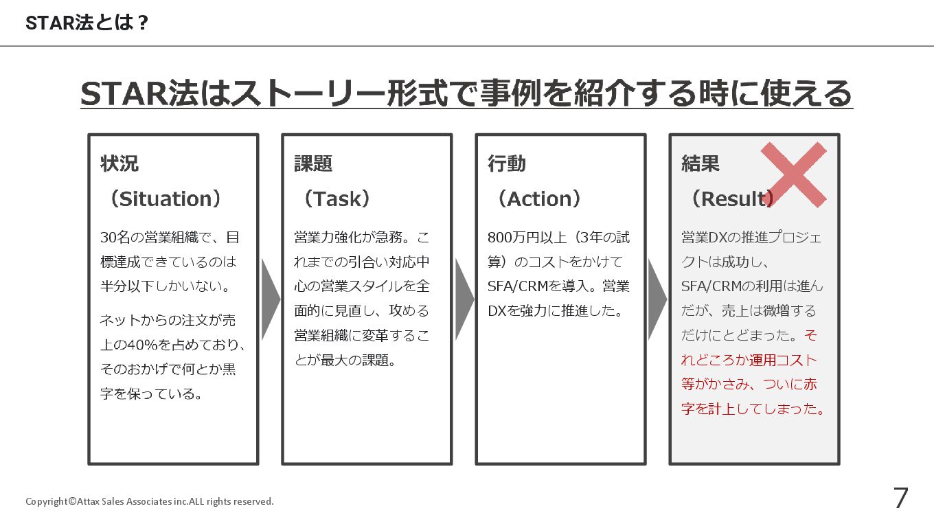 Copyright©Attax Sales Associates inc.ALL rights reserved. 7 STAR法とは︖ 30名の営業組織で、目 標達成できているのは