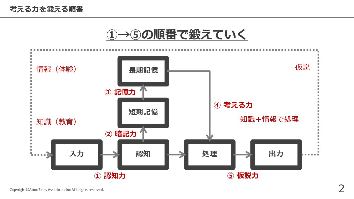 考える⼒を鍛える順番 Copyright©Attax Sales Associates inc.ALL rights reserved. 2 ⼊⼒ 認知