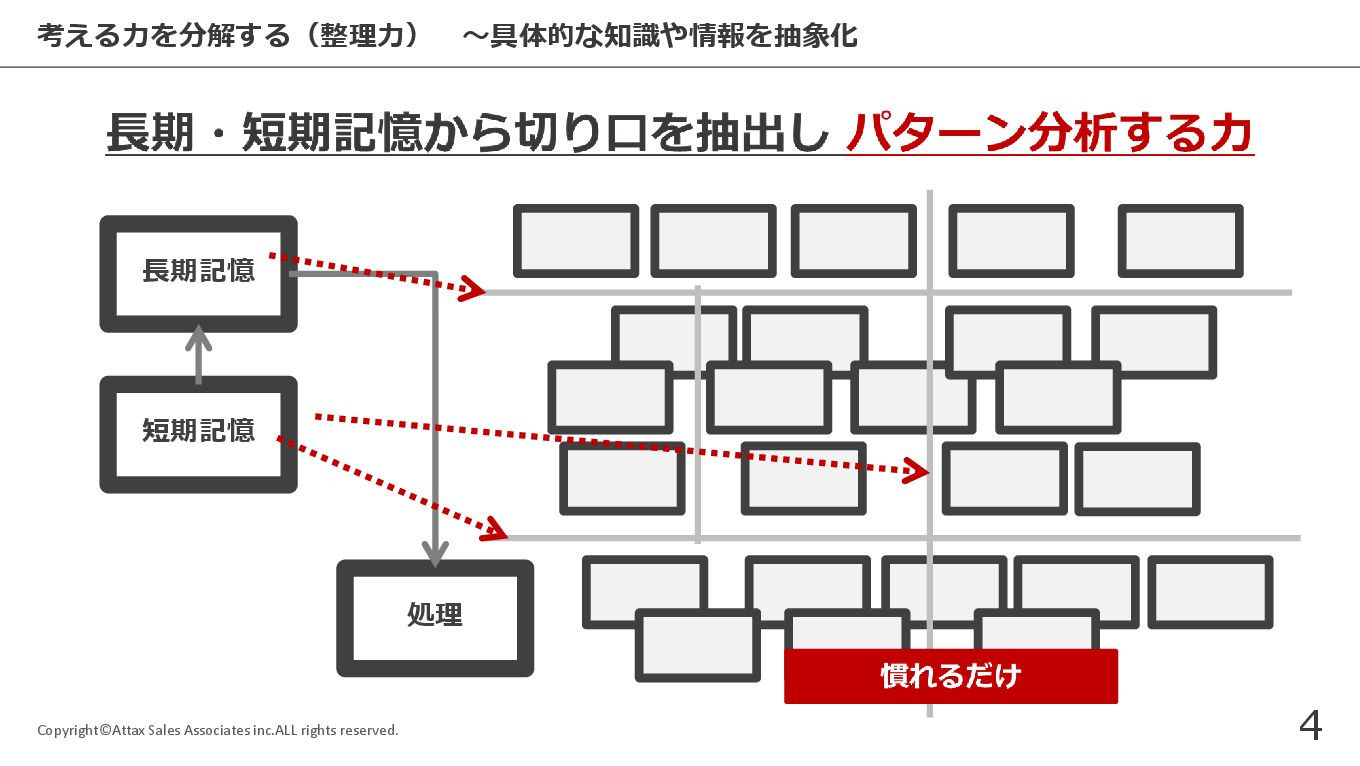 考える⼒を分解する(発散⼒) 〜具体的な知識や情報を抽出〜 Copyright©Attax Sales Associates inc.ALL rights reserved. 3 処理