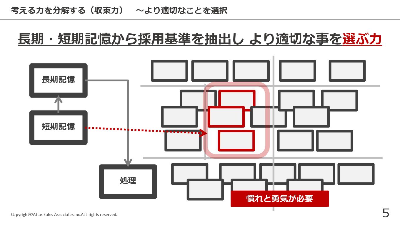 考える⼒を分解する(整理⼒) 〜具体的な知識や情報を抽象化 Copyright©Attax Sales Associates inc.ALL rights reserved. 4 処理