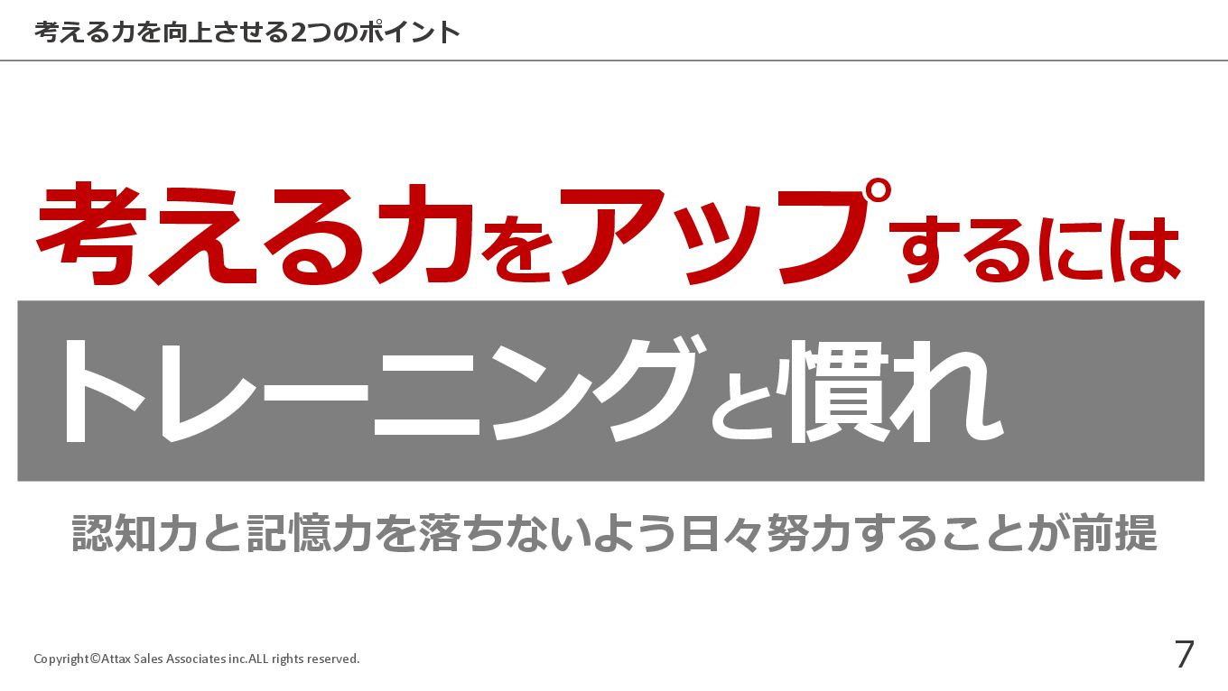 考える⼒を向上させる2つのポイント Copyright©Attax Sales Associates inc.ALL rights reserved. 7 認知⼒と記憶⼒を落ちないよう⽇々努⼒することが前提 トレーニングと慣れ
