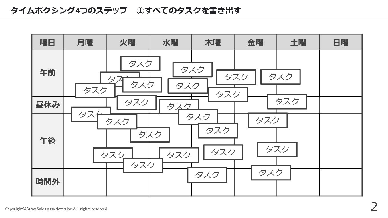 タイムボクシング4つのステップ ①すべてのタスクを書き出す Copyright©Attax Sales Associates inc.ALL rights reserved. 2 日曜