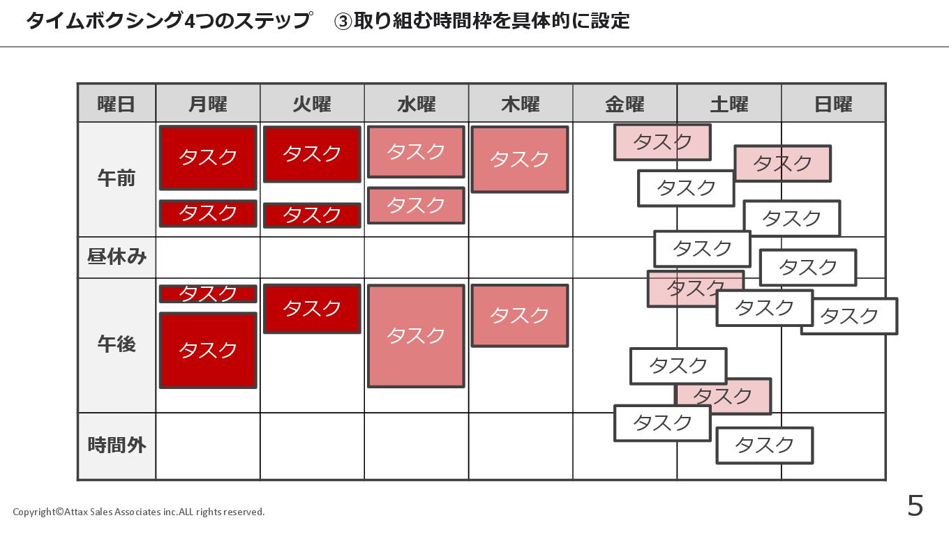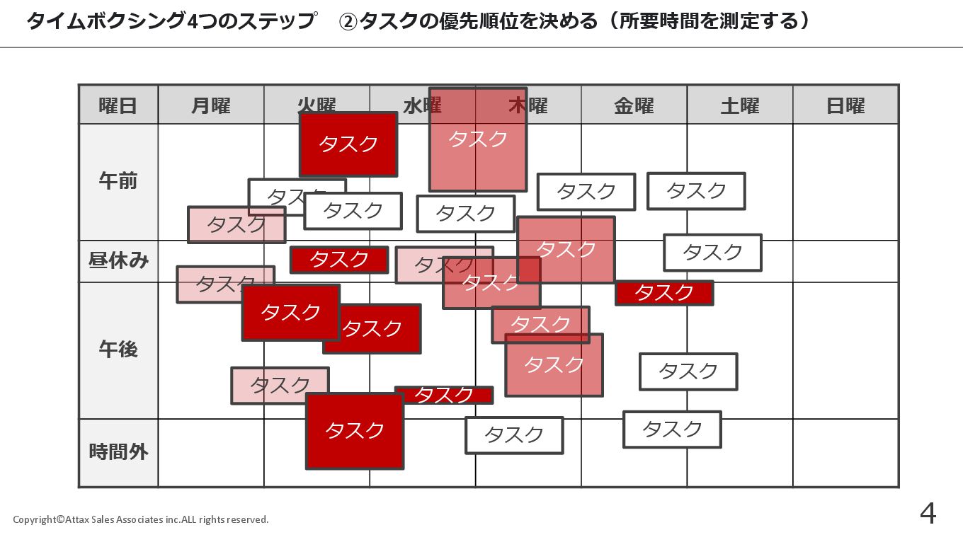 タイムボクシング4つのステップ ②タスクの優先順位を決める(所要時間を測定する) Copyright©Attax Sales Associates inc.ALL rights reserved. 4 日曜