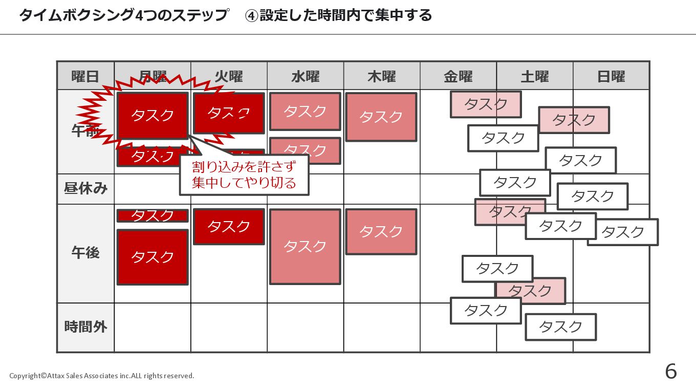 タイムボクシング4つのステップ ④設定した時間内で集中する Copyright©Attax Sales Associates inc.ALL rights reserved. 6 日曜
