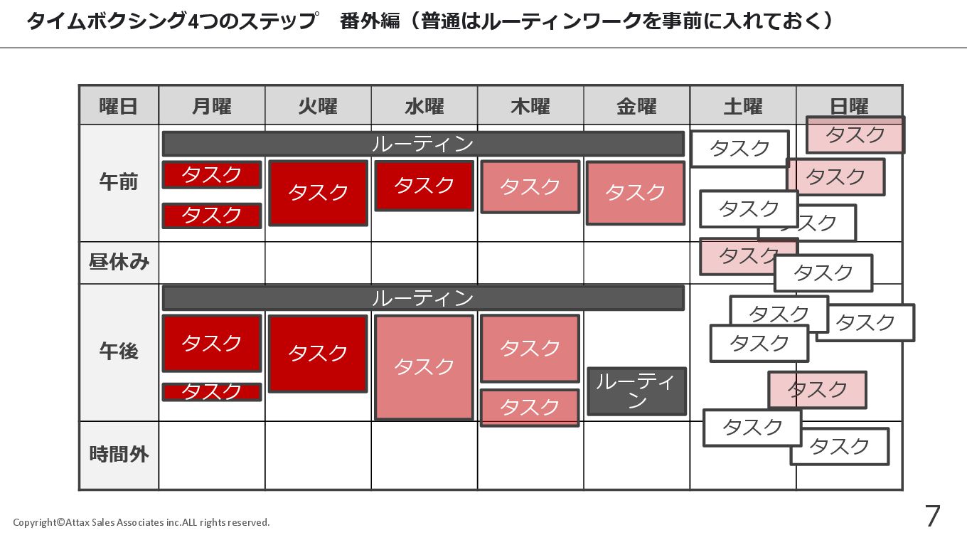 タイムボクシング4つのステップ 番外編(普通はルーティンワークを事前に入れておく) Copyright©Attax Sales Associates inc.ALL rights reserved. 7 日曜