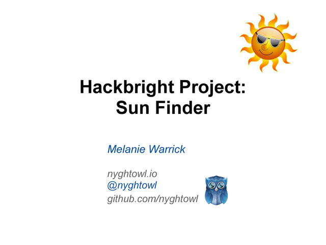 Presented high-level demo of Hackbright final project, Sun Finder. Slides provide architecture overview.