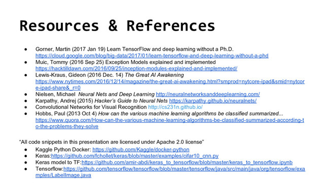 Learn TensorFlow and deep learning without a Ph.D. https://cloud.google.com/blog/big-data/2017/01/learn-tensorflow-and-deep-learning-without-a-phd • Muic, Tommy (2016 Sep 25) Exception Models explained and implemented https://hacktilldawn.com/2016/09/25/inception-modules-explained-and-implemented/ • Lewis-Kraus, Gideon (2016 Dec. 14) The Great AI Awakening https://www.nytimes.com/2016/12/14/magazine/the-great-ai-awakening.html?smprod=nytcore-ipad&smid=nytcor e-ipad-share&_r=0 • Nielsen, Michael Neural Nets and Deep Learning http://neuralnetworksanddeeplearning.com/ • Karpathy, Andrej (2015) Hacker’s Guide to Neural Nets https://karpathy.github.io/neuralnets/ • Convolutional Networks for Visual Recognition http://cs231n.github.io/ • Hobbs, Paul (2013 Oct 4) How can the various machine learning algorithms be classified summarized... https://www.quora.com/How-can-the-various-machine-learning-algorithms-be-classified-summarized-according-t o-the-problems-they-solve “All code snippets in this presentation are licensed under Apache 2.0 license” • Kaggle Python Docker: https://github.com/Kaggle/docker-python • Keras:https://github.com/fchollet/keras/blob/master/examples/cifar10_cnn.py • Keras model to TF:https://github.com/amir-abdi/keras_to_tensorflow/blob/master/keras_to_tensorflow.ipynb • Tensorflow:https://github.com/tensorflow/tensorflow/blob/master/tensorflow/java/src/main/java/org/tensorflow/exa mples/LabelImage.java