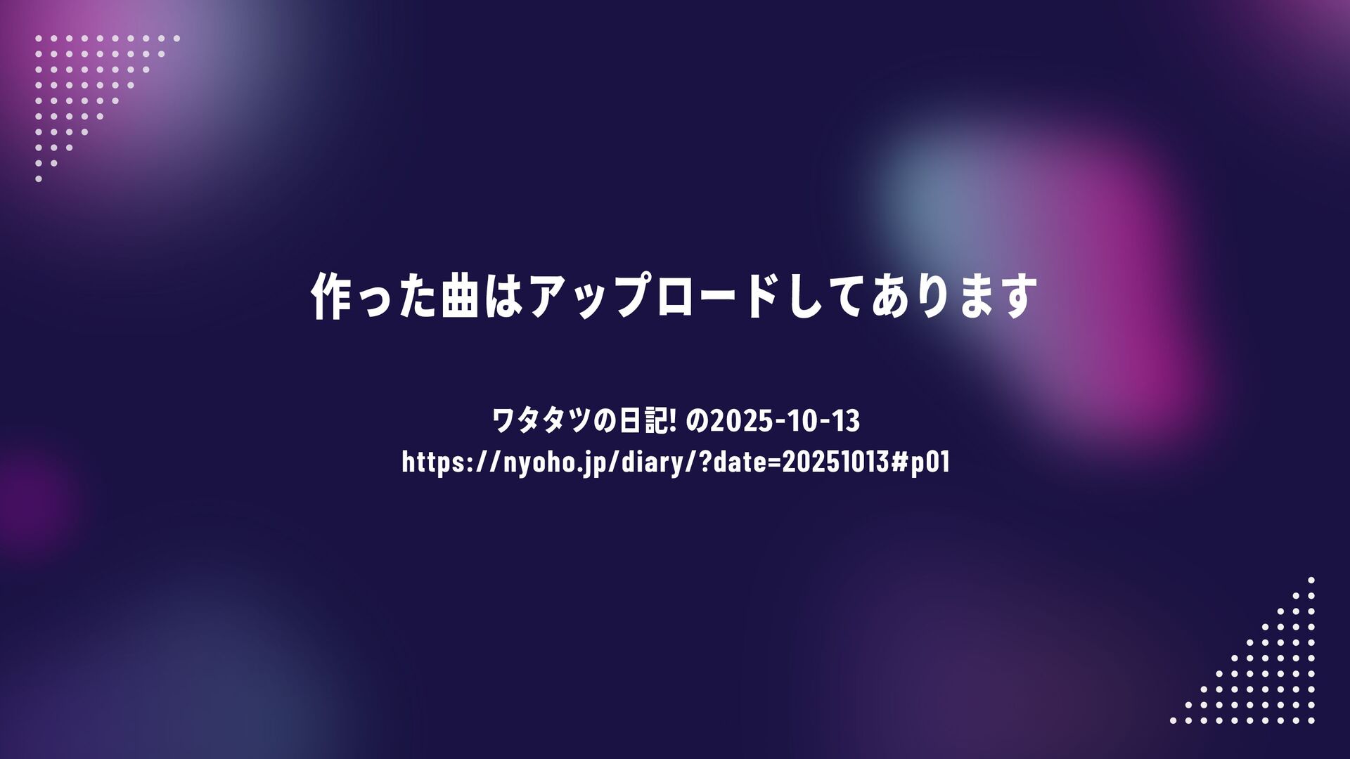 作った曲はアップロードしてあります。ワタタツの日記! の2025-10-13をご覧ください。 https://nyoho.jp/diary/?date=20251013#p01